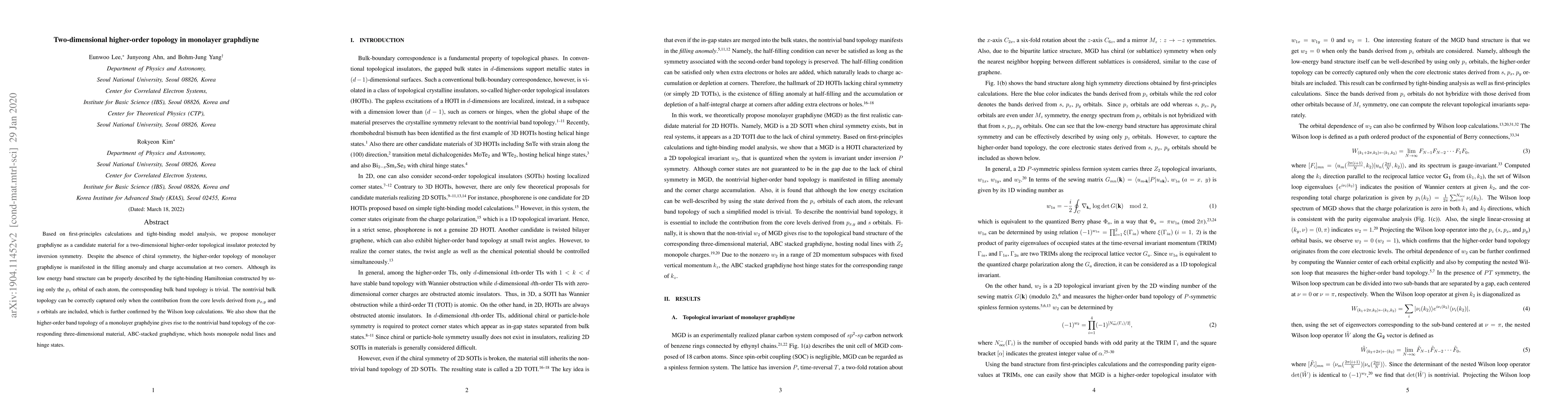 Based on first-principles calculations and tight-binding model analysis, we propose monolayer graphdiyne as a candidate material for a two-dimensional higher-order topological insulator protected by inversion symmetry. Despite the absence of chiral symmetry, the higher-order topology of monolayer graphdiyne is manifested in the filling anomaly and charge accumulation at two corners. Although its low energy band structure can be properly described by the tight-binding Hamiltonian constructed by using only the $p_z$ orbital of each atom, the corresponding bulk band topology is trivial. The nontrivial bulk topology can be correctly captured only when the contribution from the core levels derived from $p_{x,y}$ and $s$ orbitals are included, which is further confirmed by the Wilson loop calculations. We also show that the higher-order band topology of a monolayer graphdyine gives rise to the nontrivial band topology of the corresponding three-dimensional material, ABC-stacked graphdiyne, which hosts monopole nodal lines and hinge states.