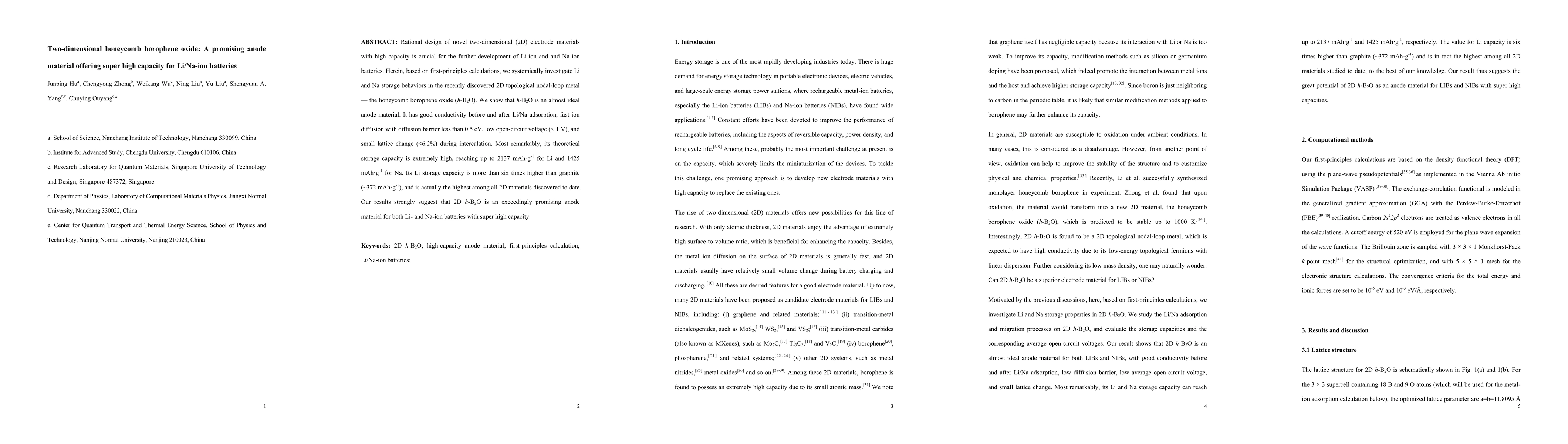 This research paper investigates the potential of honeycomb borophene oxide (h-B2O) as a super high capacity anode material for Li/Na-ion batteries, revealing its excellent conductivity, fast ion diffusion, and theoretical storage capacities of 2137 mAh/g for Li and 1425 mAh/g for Na, significantly outperforming graphite and other 2D materials.