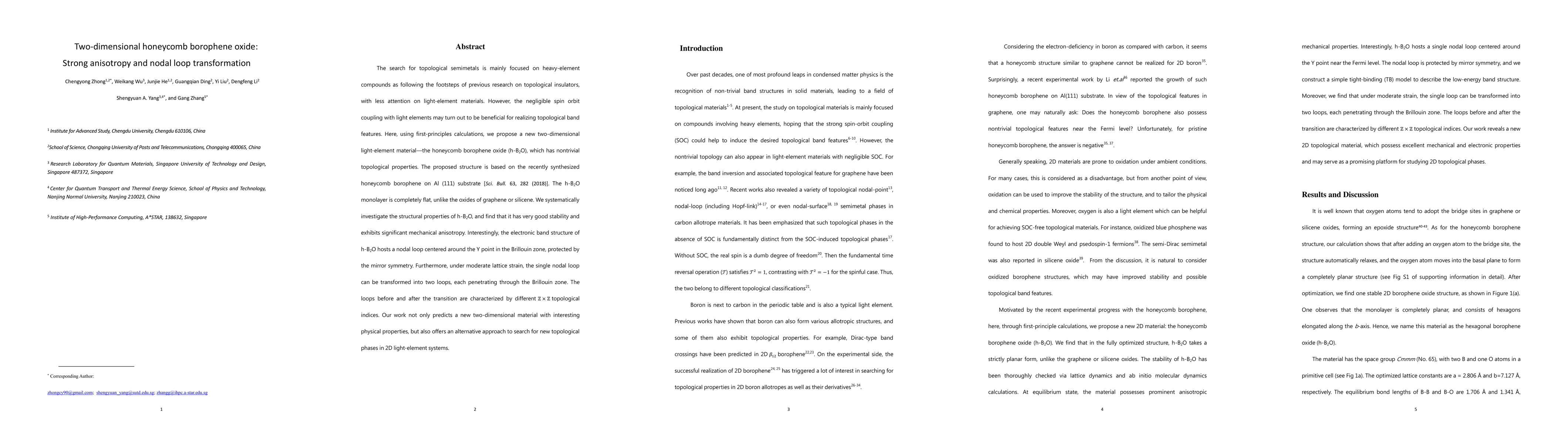 The search for topological semimetals is mainly focused on heavy-element compounds as following the footsteps of previous research on topological insulators, with less attention on light-element materials. However, the negligible spin orbit coupling with light elements may turn out to be beneficial for realizing topological band features.Here, using first-principles calculations, we propose a new two-dimensional light-element material-the honeycomb borophene oxide (h-B2O), which has nontrivial topological properties.The proposed structure is based on the recently synthesized honeycomb borophene on Al (111) substrate [Sci. Bull. 63, 282 (2018)]. The h-B2O monolayer is completely flat, unlike the oxides of graphene or silicene. We systematically investigate the structural properties of h-B2O, and find that it has very good stability and exhibits significant mechanical anisotropy. Interestingly, the electronic band structure of h-B2O hosts a nodal loop centered around the Y point in the Brillouin zone, protected by the mirror symmetry. Furthermore, under moderate lattice strain, the single nodal loop can be transformed into two loops, each penetrating through the Brillouin zone. The loops before and after the transition are characterized by different Z*Z topological indices. Our work not only predicts a new two-dimensional material with interesting physical properties, but also offers an alternative approach to search for new topological phases in 2D light-element systems.