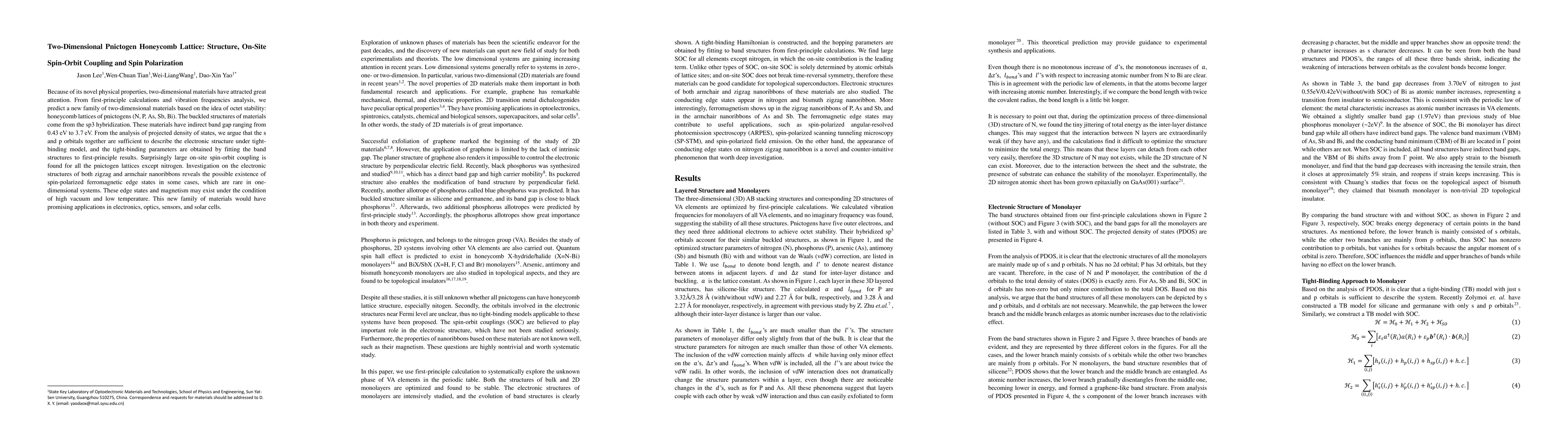 Because of its novel physical properties, two-dimensional materials have attracted great attention. From first-principle calculations and vibration frequenceis analysis, we predict a new family of two-dimensional materials based on the idea of octet stability: honeycomb lattices of pnictogens (N, P, As, Sb, Bi). The buckled structures of materials come from the sp3 hybridization. These materials have indirect band gap ranging from 0.43eV to 3.7eV. From the analysis of projected density of states, we argue that the s and p orbitals together are sufficient to describe the electronic structure under tight-binding model, and the tight-binding parameters are obtained by fitting the band structures to first-principle results. Surprisingly large on-site spin-orbit coupling is found for all the pnictogen lattices except nitrogen. Investigation on the electronic structures of both zigzag and armchair nanoribbons reveals the possible existence of spin-polarized ferromagnetic edge states in some cases, which are rare in one-dimensional systems. These edge states and magnetism may exist under the condition of high vaccum and low temperature. This new family of materials would have promising applications in electronics, optics, sensors, and solar cells.