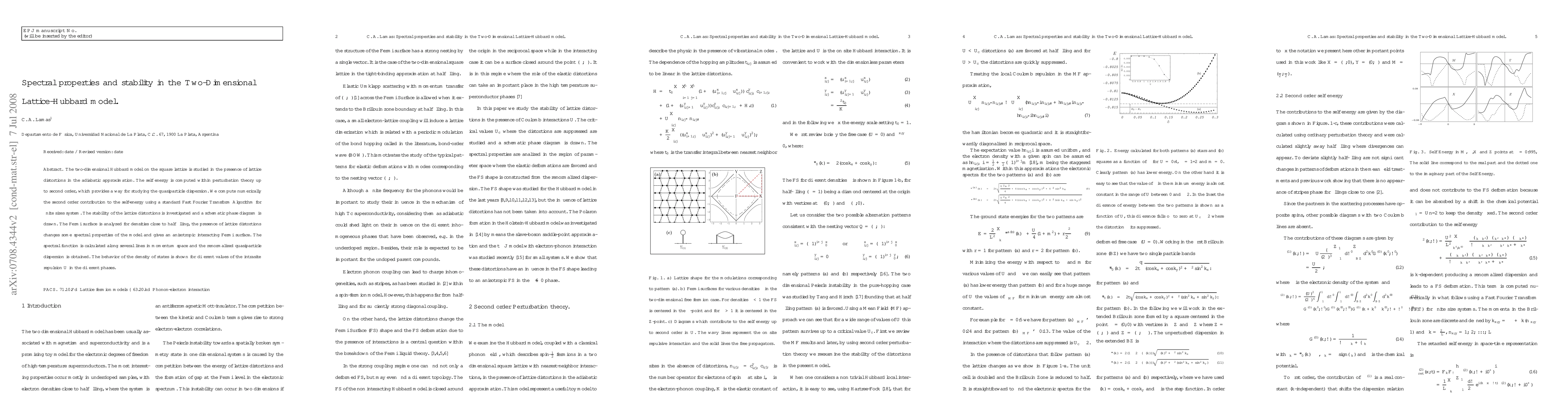 This paper investigates the two-dimensional Hubbard model under lattice distortions using perturbation theory up to second order, revealing anisotropic quasiparticle dispersion and changes in the Fermi surface near half-filling. A phase diagram is constructed, showing the stability of lattice distortions and their impact on spectral properties.