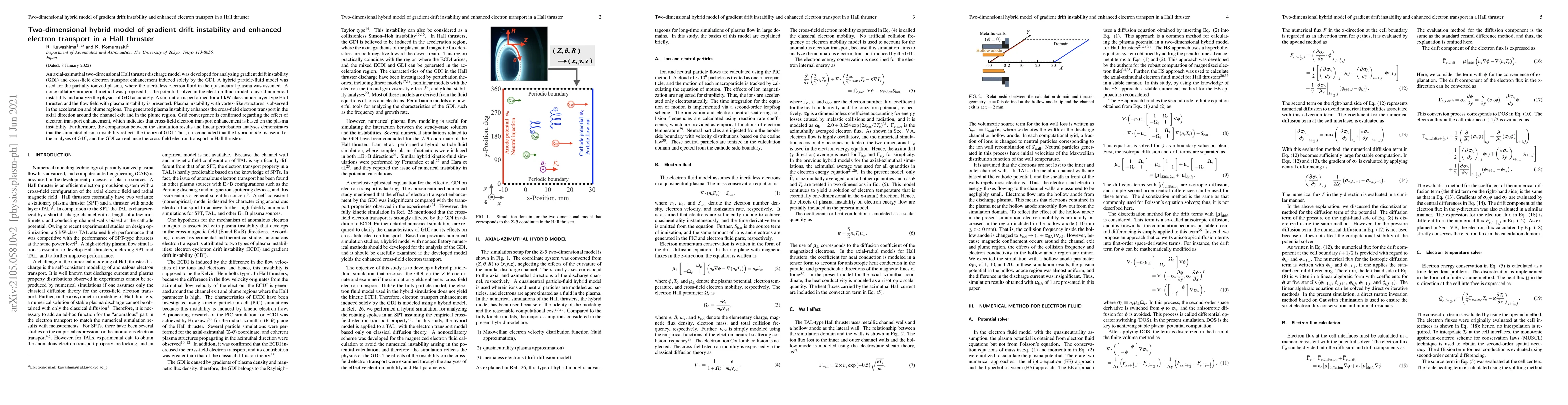 An axial-azimuthal two-dimensional Hall thruster discharge model was developed for analyzing gradient drift instability (GDI) and cross-field electron transport enhancement induced solely by the GDI. A hybrid particle-fluid model was used for the partially ionized plasma, where the inertialess electron fluid in the quasineutral plasma was assumed. A nonoscillatory numerical method was proposed for the potential solver in the electron fluid model to avoid numerical instability and analyze the physics of GDI accurately. A simulation is performed for a 1 kW-class anode-layer-type Hall thruster, and the flow field with plasma instability is presented. Plasma instability with vortex-like structures is observed in the acceleration and plume regions. The generated plasma instability enhances the cross-field electron transport in the axial direction around the channel exit and in the plume region. Grid convergence is confirmed regarding the effect of electron transport enhancement, which indicates that cross-field electron transport enhancement is based on the plasma instability. Furthermore, the comparison between the simulation results and linear perturbation analyses demonstrates that the simulated plasma instability reflects the theory of GDI. Thus, it is concluded that the hybrid model is useful for the analyses of GDI, and the GDI can enhance the cross-field electron transport in Hall thrusters.