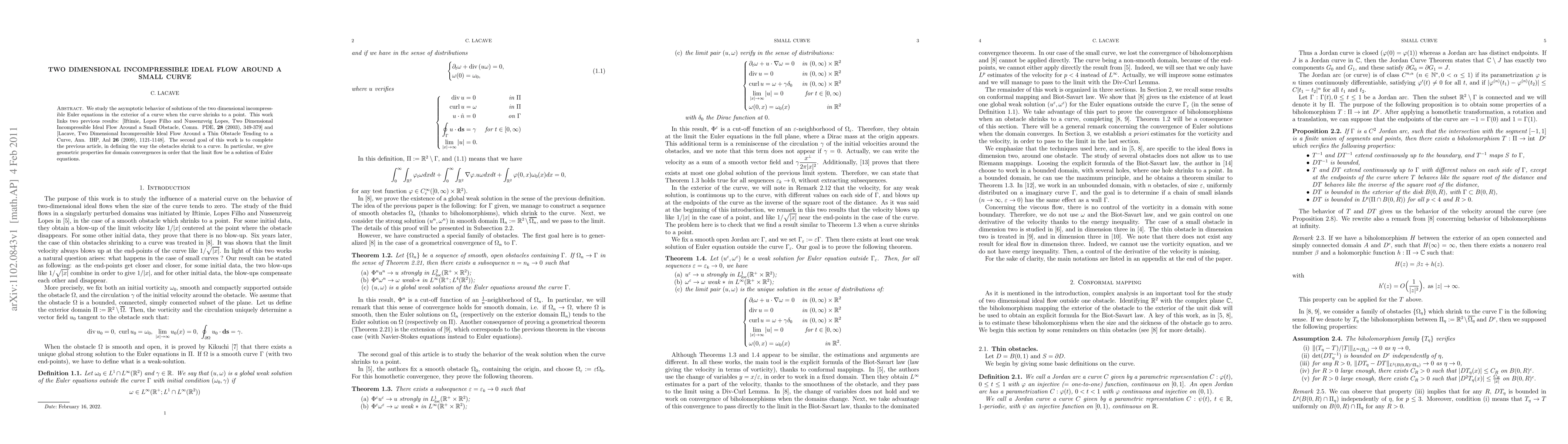 This paper investigates the asymptotic behavior of two-dimensional incompressible ideal flow as a small curve shrinks to a point, linking and completing previous results on flow around small obstacles and thin obstacles. It provides geometric properties for domain convergence to ensure the limit flow satisfies the Euler equations.