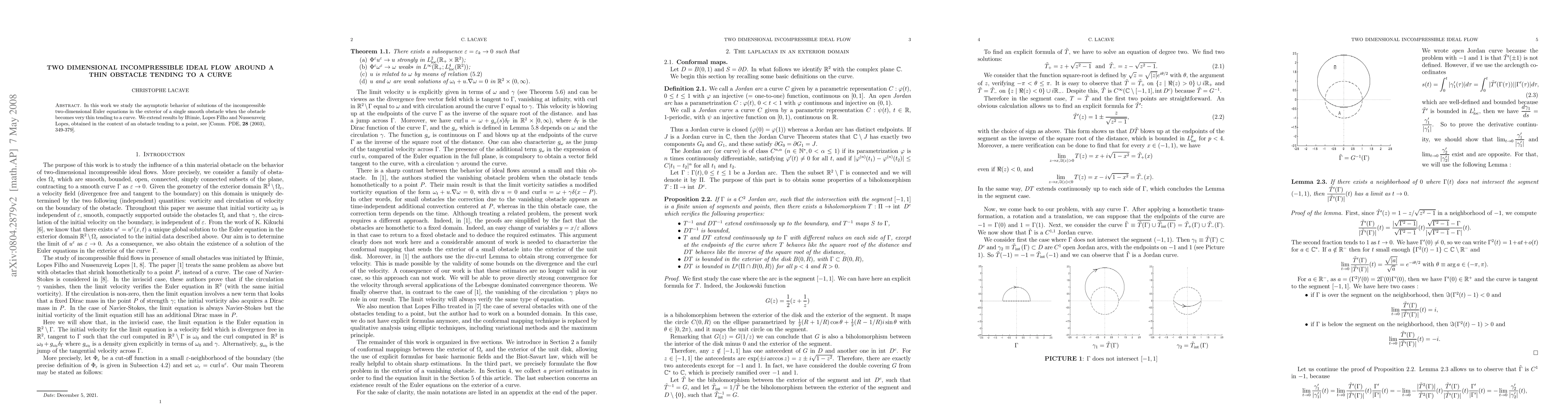 This paper investigates the asymptotic behavior of two-dimensional incompressible ideal flow around a thin obstacle approaching a curve, extending previous results for an obstacle tending to a point. The study focuses on solutions of the Euler equations in the exterior of the obstacle.