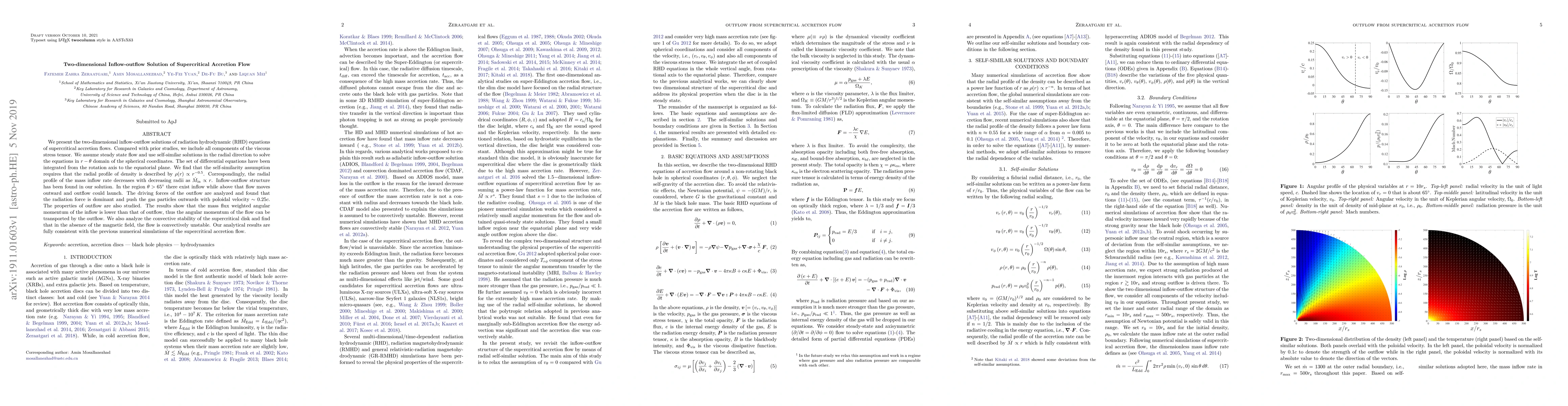 This paper presents two-dimensional inflow-outflow solutions for supercritical accretion flows using self-similar solutions in the radial direction. The study finds that the radial density profile follows $\rho(r) \propto r^{-0.5}$ and the mass inflow rate decreases with radius. The analysis shows that radiation force drives an outflow with poloidal velocity $\sim 0.25 c$, and the angular momentum transport is facilitated by the outflow.