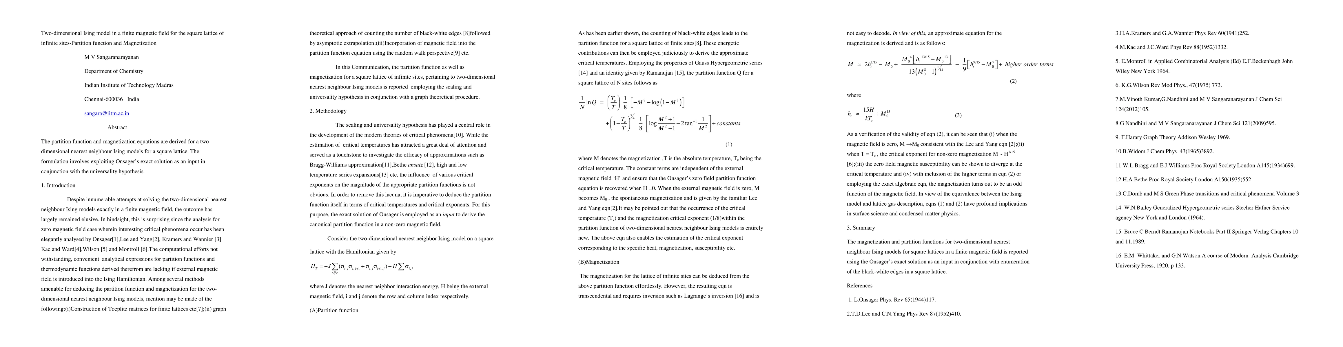 Summary: This paper derives the partition function and magnetization equations for the two-dimensional nearest-neighbour Ising model on an infinite square lattice under a finite magnetic field. Analytical expressions are provided for these key thermodynamic quantities.