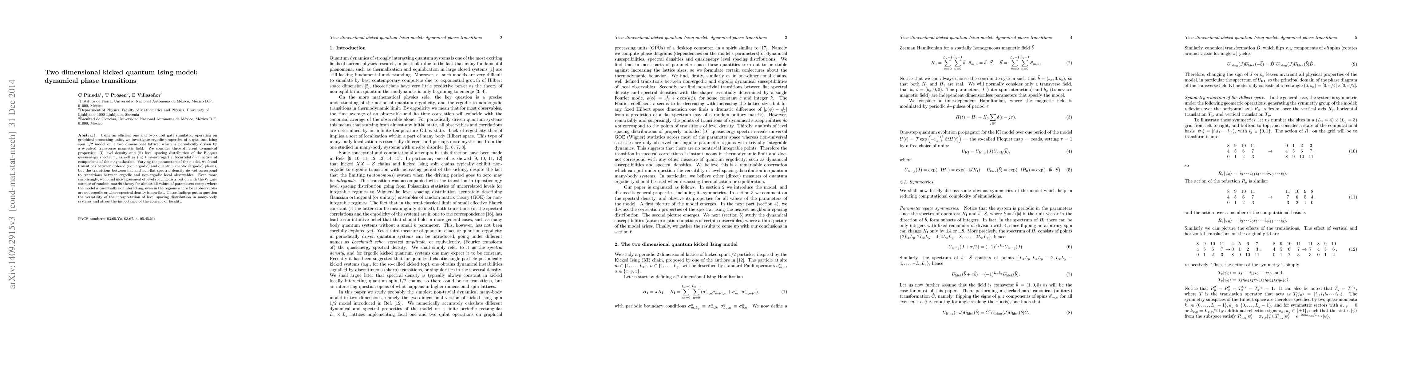 Using an efficient one and two qubit gate simulator, operating on graphical processing units, we investigate ergodic properties of a quantum Ising spin 1/2 model on a two dimensional lattice, which is periodically driven by a $\delta$-pulsed transverse magnetic field. We consider three different dynamical properties: (i) level density and (ii) level spacing distribution of the Floquet quasienergy spectrum, as well as (iii) time-averaged autocorrelation function of components of the magnetization. Varying the parameters of the model, we found transitions between ordered (non ergodic) and quantum chaotic (ergodic) phases, but the transitions between flat and non-flat spectral density {\em do not} correspond to transitions between ergodic and non-ergodic local observables. Even more surprisingly, we found nice agreement of level spacing distribution with the Wigner surmise of random matrix theory for almost all values of parameters except where the model is essentially noninteracting, even in the regions where local observables are not ergodic or where spectral density is non-flat. These findings put in question the versatility of the interpretation of level spacing distribution in many-body systems and stress the importance of the concept of locality.