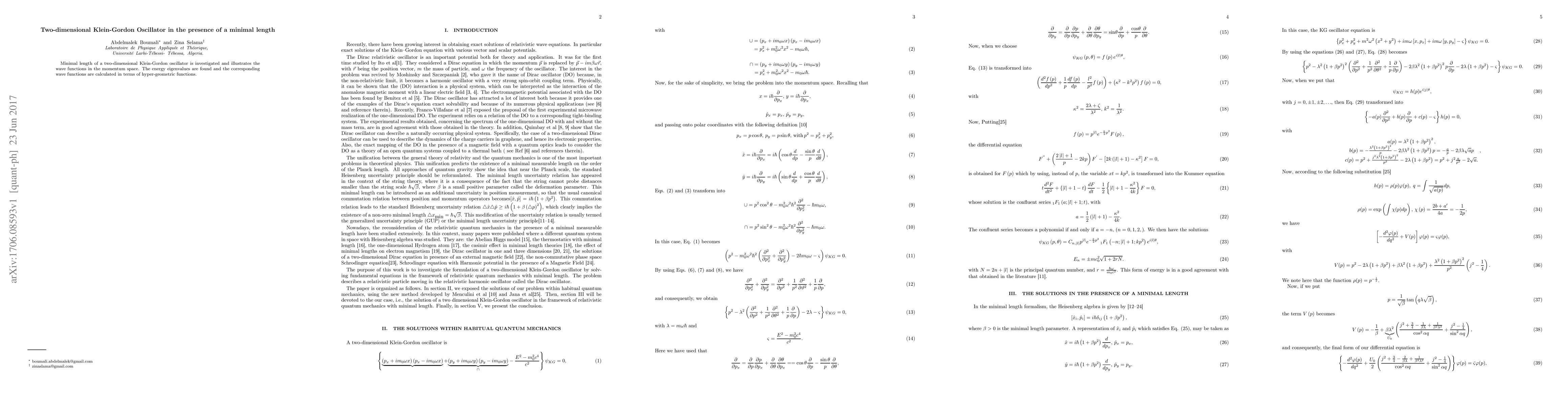 This paper investigates the two-dimensional Klein-Gordon oscillator with a consideration of minimal length, deriving the energy eigenvalues and expressing the corresponding wave functions in momentum space using hyper-geometric functions.