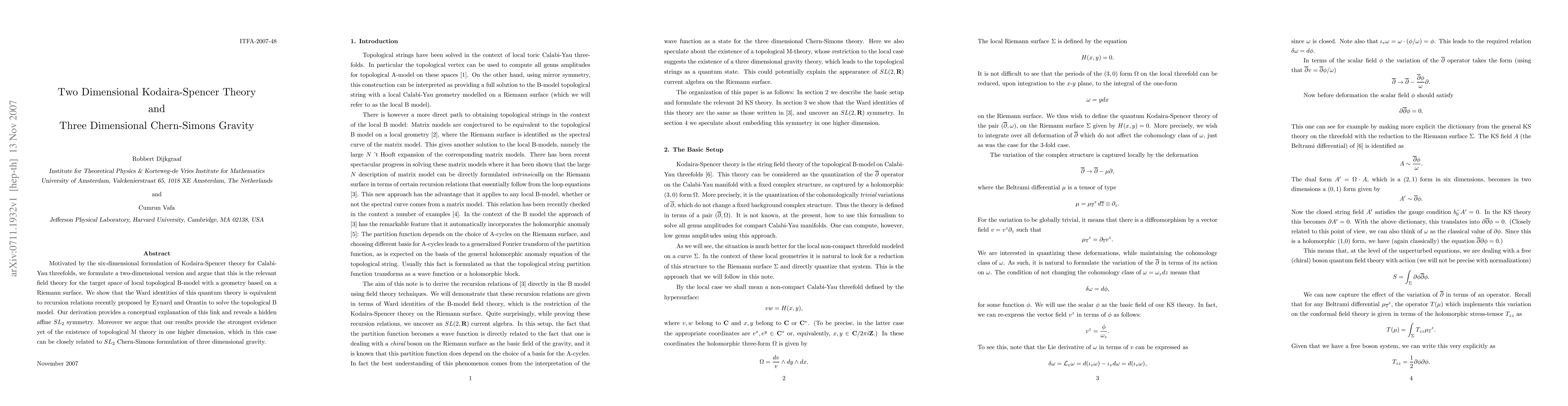 This paper formulates a two-dimensional version of Kodaira-Spencer theory and establishes its equivalence to recursion relations for solving the topological B model. It reveals an underlying affine SL(2,R) symmetry and suggests a connection to three-dimensional Chern-Simons gravity, hinting at the existence of topological M theory.