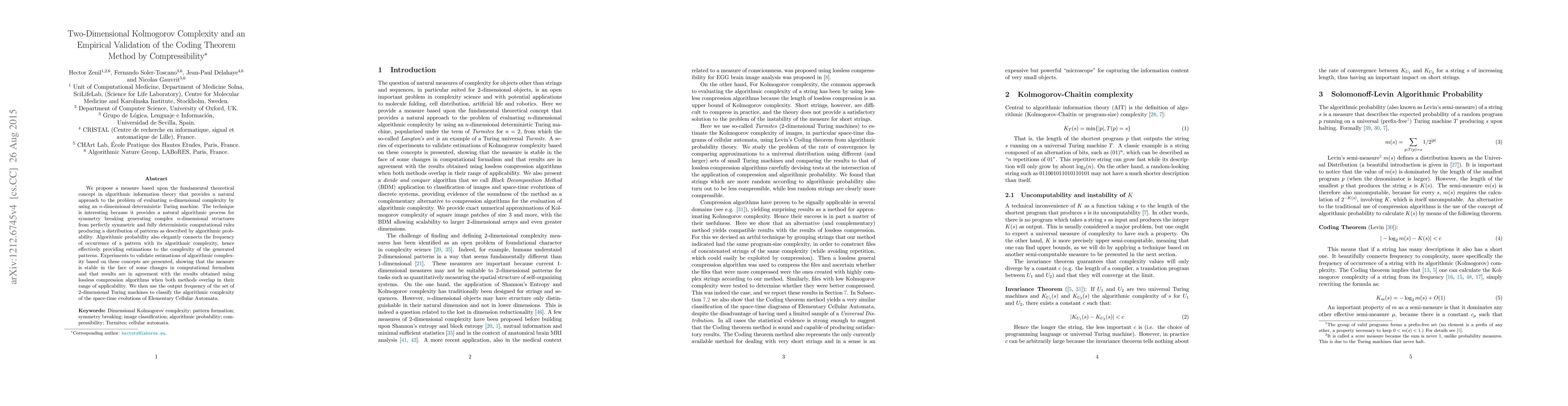 This paper introduces a 2D Kolmogorov complexity measure using n-dimensional Turing machines, demonstrating its stability and agreement with compression algorithms. It applies this method to classify the complexity of Elementary Cellular Automata space-time evolutions.