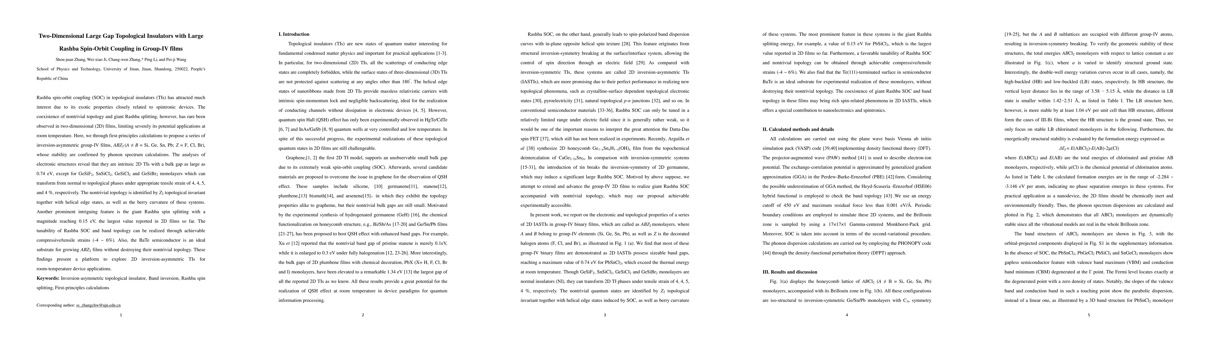 Rashba spin orbit coupling in topological insulators has attracted much interest due to its exotic properties closely related to spintronic devices. The coexistence of nontrivial topology and giant Rashba splitting, however, has rare been observed in two-dimensional films, limiting severely its potential applications at room temperature. Here, we propose a series of inversion asymmetric group IV films, ABZ2, whose stability are confirmed by phonon spectrum calculations. The analyses of electronic structures reveal that they are intrinsic 2D TIs with a bulk gap as large as 0.74 eV, except for GeSiF2, SnSiCl2, GeSiCl2 and GeSiBr2 monolayers which can transform from normal to topological phases under appropriate tensile strains. Another prominent intriguing feature is the giant Rashba spin splitting with a magnitude reaching 0.15 eV, the largest value reported in 2D films. These results present a platform to explore 2D TIs for room temperature device applications.