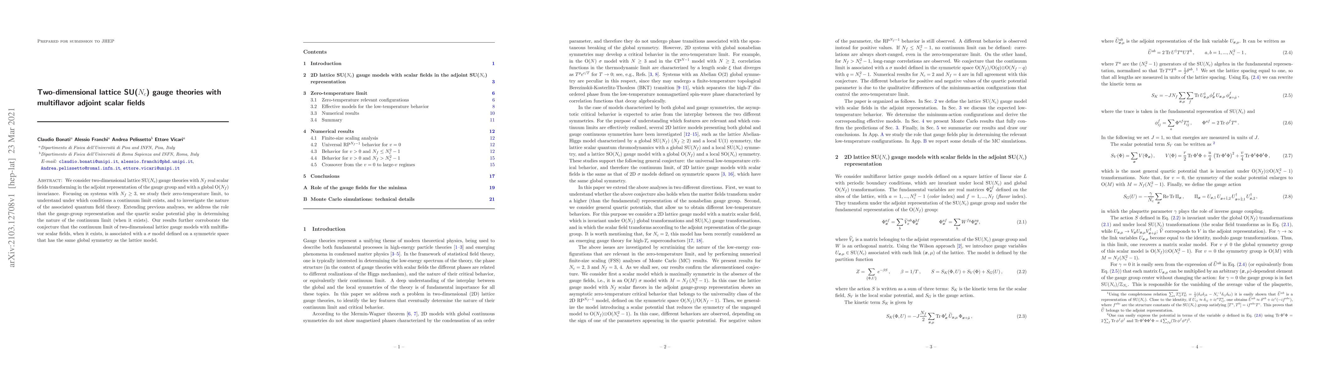 This paper investigates two-dimensional lattice SU($N_c$) gauge theories with multiflavor adjoint scalar fields, focusing on systems with $N_f\ge 3$. It explores the conditions under which a continuum limit exists and the nature of the associated quantum field theory, confirming the conjecture that such a limit corresponds to a $\sigma$ model on a symmetric space.