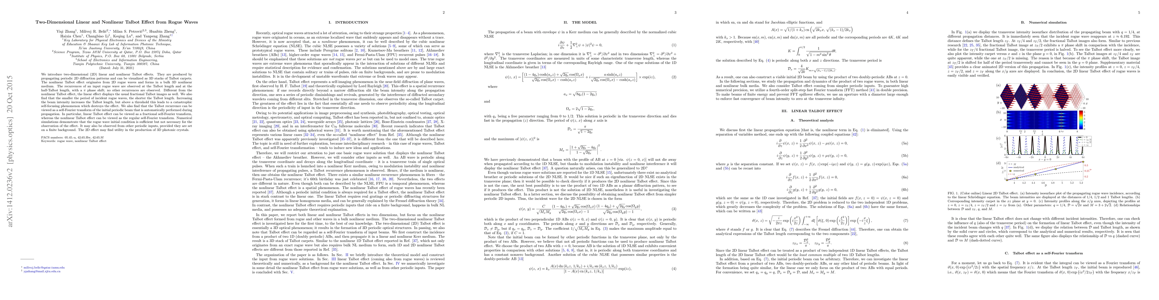 This paper explores two-dimensional linear and nonlinear Talbot effects, revealing the recurrence of periodic diffraction patterns visualized as 3D stacks of Talbot carpets. The nonlinear effect, originating from rogue waves, shows recurrences with a π phase shift, while the linear effect exhibits fractional Talbot images.