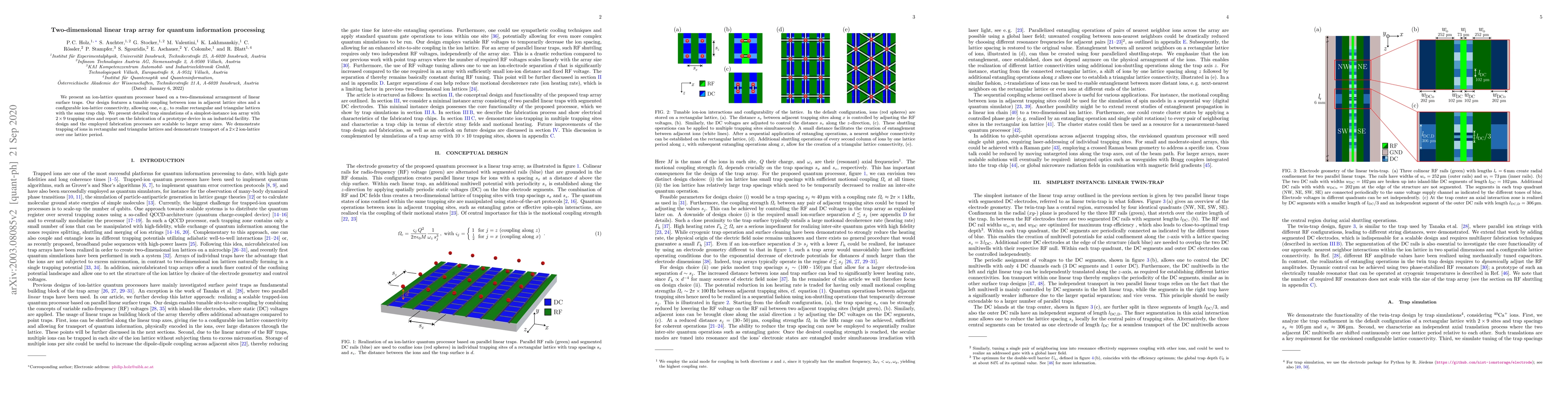 This paper introduces a two-dimensional linear trap array for quantum information processing, featuring tunable ion coupling and configurable connectivity. The prototype device, fabricated in an industrial setting, demonstrates trapping and transport of ions in rectangular and triangular lattices, showcasing scalability for larger arrays.