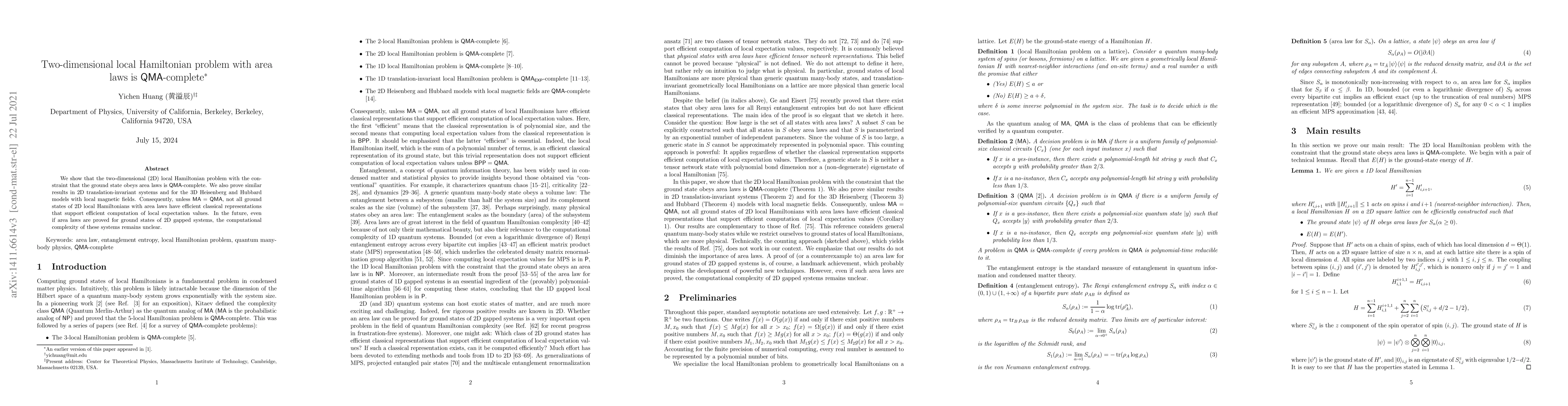 The paper demonstrates that the 2D local Hamiltonian problem, constrained by area laws, is QMA-complete, implying that not all such ground states can be efficiently classically represented unless MA equals QMA. This complexity extends to 2D translation-invariant systems and 3D Heisenberg and Hubbard models with local magnetic fields.