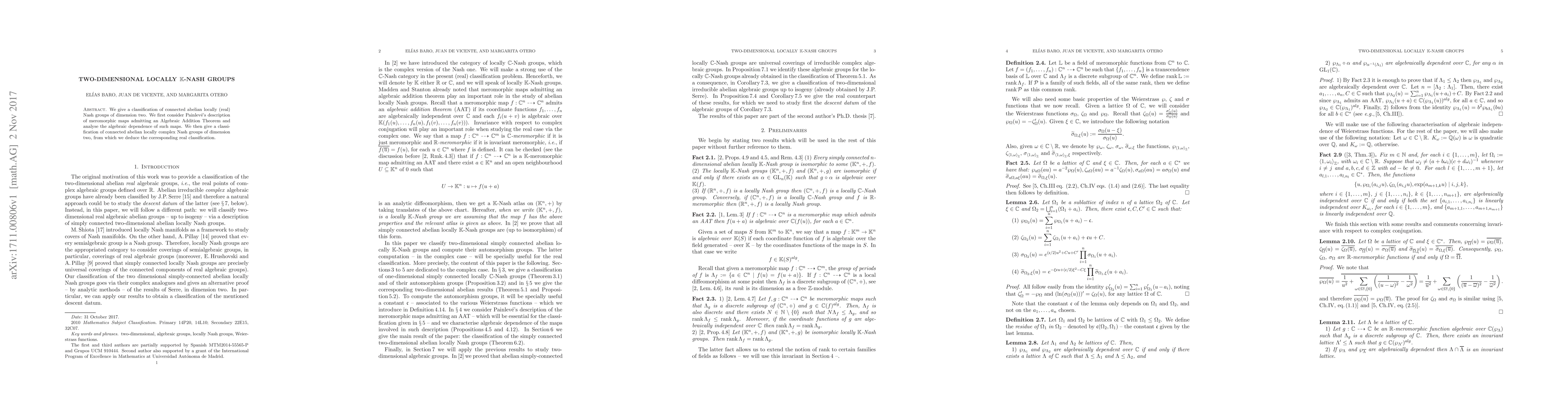 This paper classifies connected abelian two-dimensional locally Nash groups, first analyzing meromorphic maps with an Algebraic Addition Theorem and then deriving classifications for both real and complex cases.