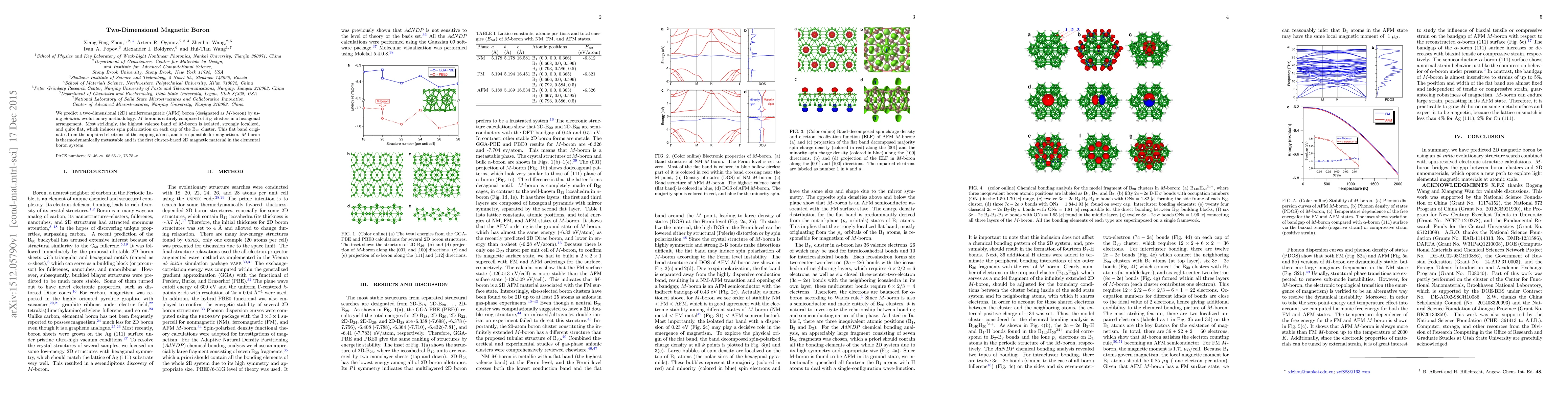 We predict a two-dimensional (2D) antiferromagnetic (AFM) boron (designated as M-boron) by using ab initio evolutionary methodology. M-boron is entirely composed of B20 clusters in a hexagonal arrangement. Most strikingly, the highest valence band of M-boron is isolated, strongly localized, and quite flat, which induces spin polarization on each cap of the B20 cluster. This flat band originates from the unpaired electrons of the capping atoms, and is responsible for magnetism. M-boron is thermodynamically metastable and is the first cluster-based 2D magnetic material in the elemental boron system.