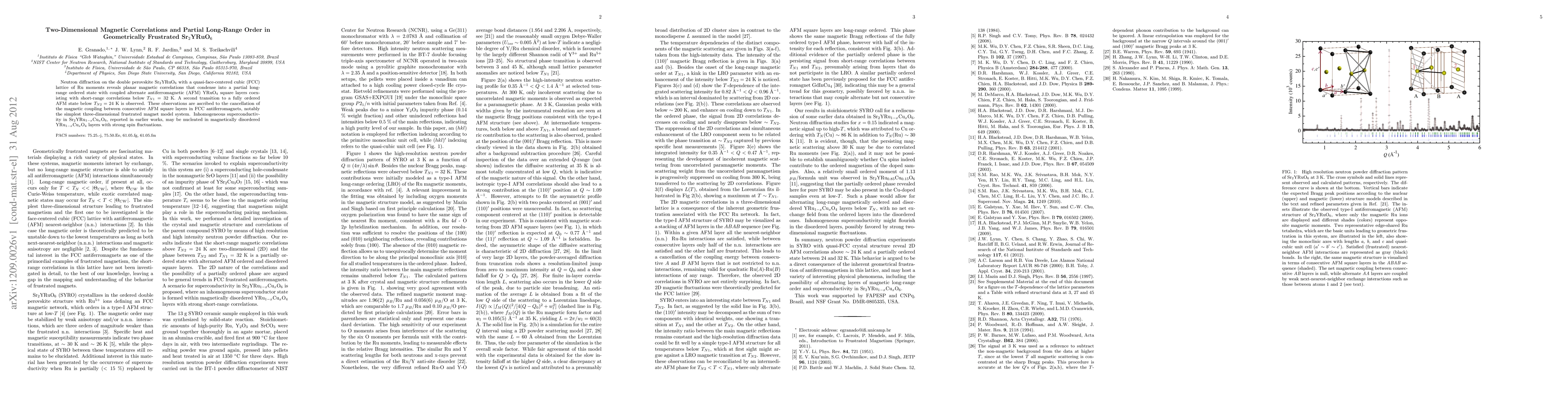 This study uses neutron diffraction to explore the magnetic structure of Sr2YRuO6, finding planar magnetic correlations that partially order into an antiferromagnetic state below 32 K, followed by a full order below 24 K, attributed to geometric frustration and cancellation of magnetic coupling. The paper also suggests that superconductivity in related compounds may arise from spin fluctuations in disordered layers.