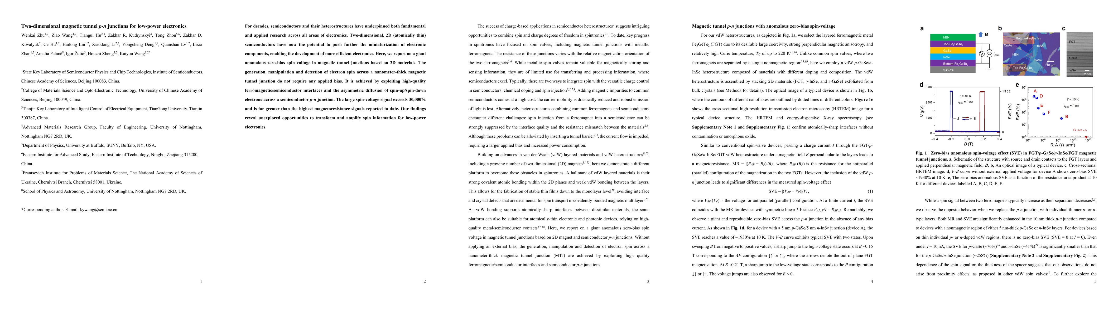 For decades, semiconductors and their heterostructures have underpinned both fundamental and applied research across all areas of electronics. Two-dimensional, 2D (atomically thin) semiconductors have now the potential to push further the miniaturization of electronic components, enabling the development of more efficient electronics. Here, we report on a giant anomalous zero-bias spin voltage in magnetic tunnel junctions based on 2D materials. The generation, manipulation and detection of electron spin across a nanometer-thick magnetic tunnel junction do not require any applied bias. It is achieved by exploiting high-quality ferromagnetic/semiconductor interfaces and the asymmetric diffusion of spin-up/spin-down electrons across a semiconductor p-n junction. The large spin-voltage signal exceeds 30,000% and is far greater than the highest magnetoresistance signals reported to date. Our findings reveal unexplored opportunities to transform and amplify spin information for low-power electronics.