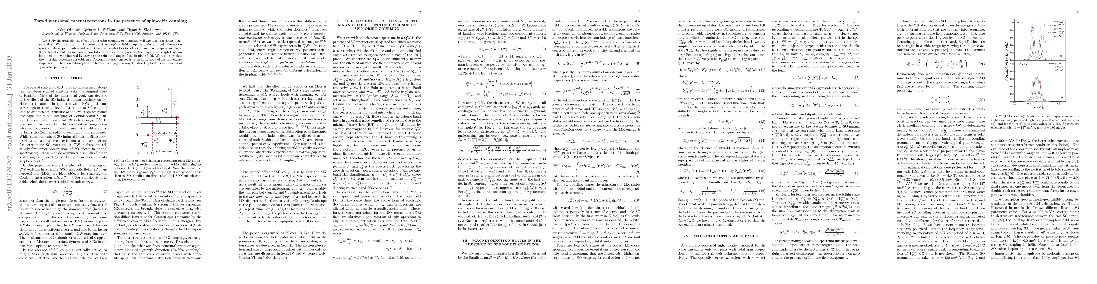 This paper theoretically investigates the impact of spin-orbit coupling on excitons in quantum wells under a strong magnetic field, revealing a double-peak structure in the absorption spectrum due to magnetoexciton hybridization. The study also demonstrates that the splitting magnitude can be tuned by adjusting the in-plane field angle, and highlights the anisotropy of exciton energy dispersion influenced by spin-orbit and Coulomb interactions.