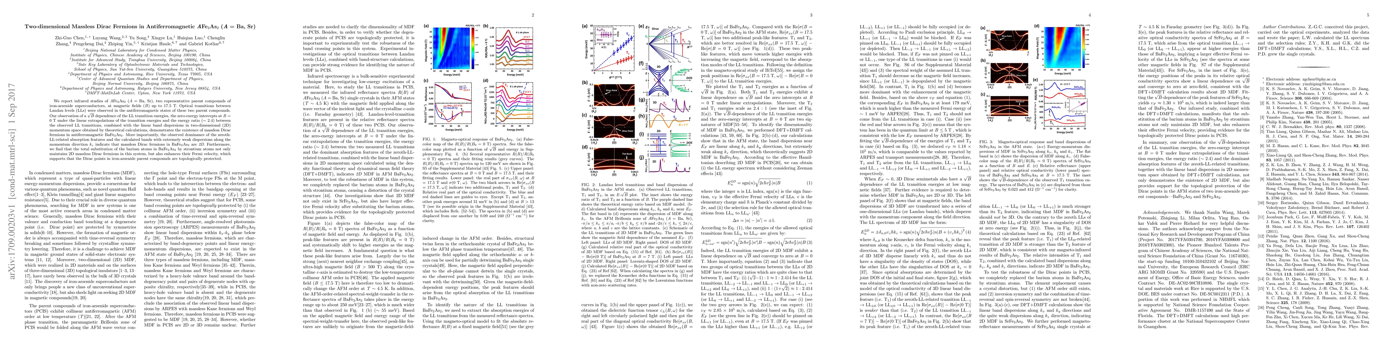 This study reveals the presence of two-dimensional massless Dirac fermions in antiferromagnetic BaFe$_2$As$_2$ and SrFe$_2$As$_2$ through infrared spectroscopy, showing $\sqrt{B}$ dependence of Landau level transitions. The results suggest topological protection of the Dirac points and enhanced Fermi velocity with substitution of barium by strontium.