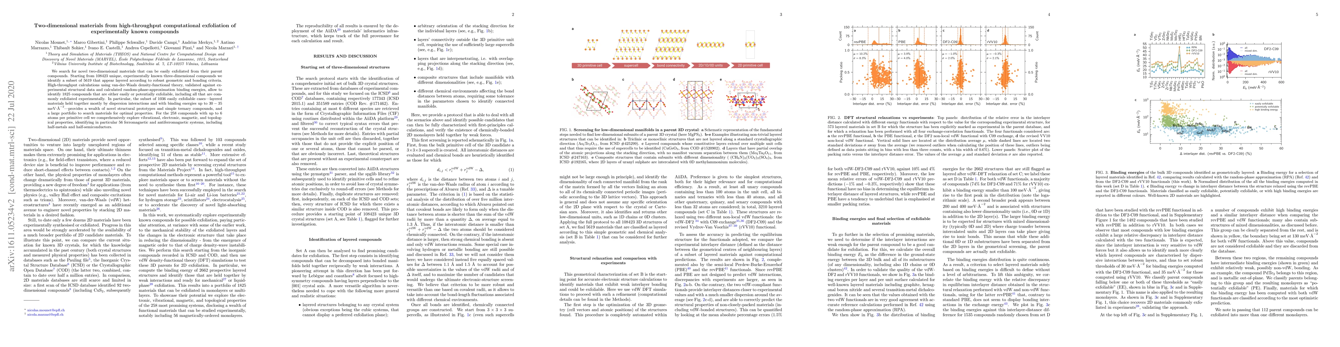 This paper identifies potential two-dimensional materials through high-throughput computational exfoliation of 108,423 experimentally known three-dimensional compounds, finding 1,825 that are easily or potentially exfoliable. It highlights 1,036 materials held together by dispersion interactions, offering novel structural prototypes and a basis for searching optimal material properties.