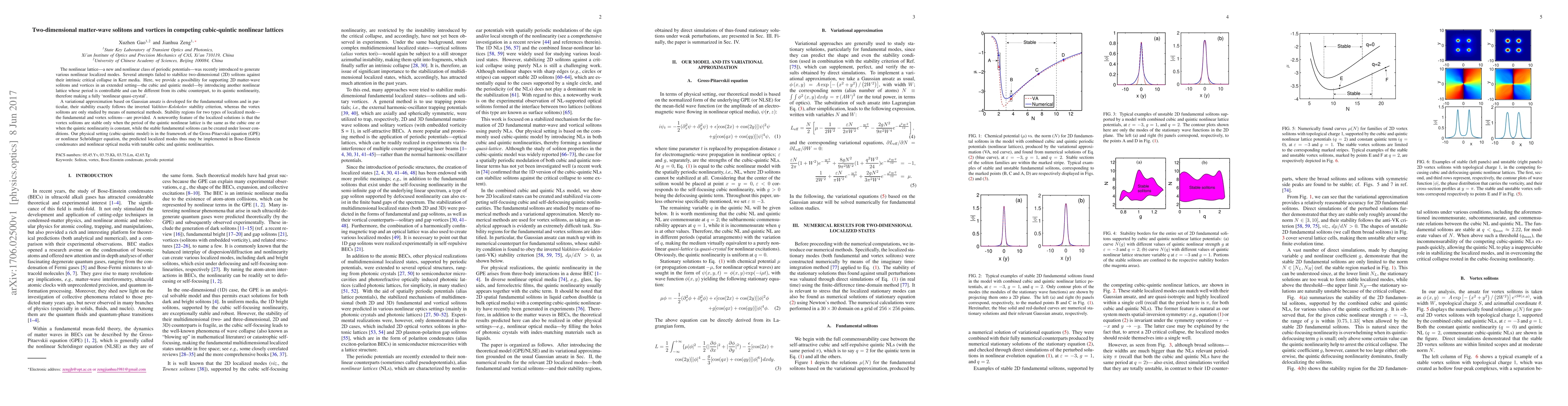 This paper explores the stabilization of two-dimensional matter-wave solitons and vortices in cubic-quintic nonlinear lattices, introducing a tunable nonlinear quasi-crystal. Stability regions for fundamental and vortex solitons are identified, with vortex solitons requiring specific conditions for stability, while fundamental solitons can be more easily stabilized.