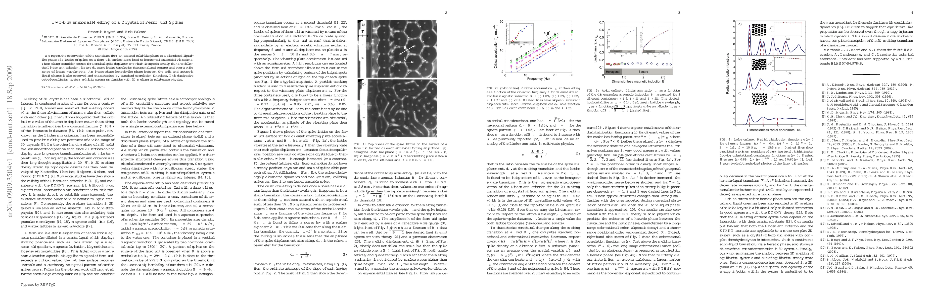 We report the observation of the transition from an ordered solid-like phase to a disordered liquid-like phase of a lattice of spikes on a ferrofluid surface submitted to horizontal sinusoidal vibrations. The melting transition occurs for a critical spike displacement which is experimentally found to follow the Lindemann criterion, for two different lattice topologies (hexagonal and square) and over a wide range of lattice wavelengths. An intermediate hexatic-like phase between the solid and isotropic liquid phases is also observed and characterized by standard correlation functions. This dissipative out-of-equilibrium system exhibits strong similarities with 2D melting in solid-state physics.