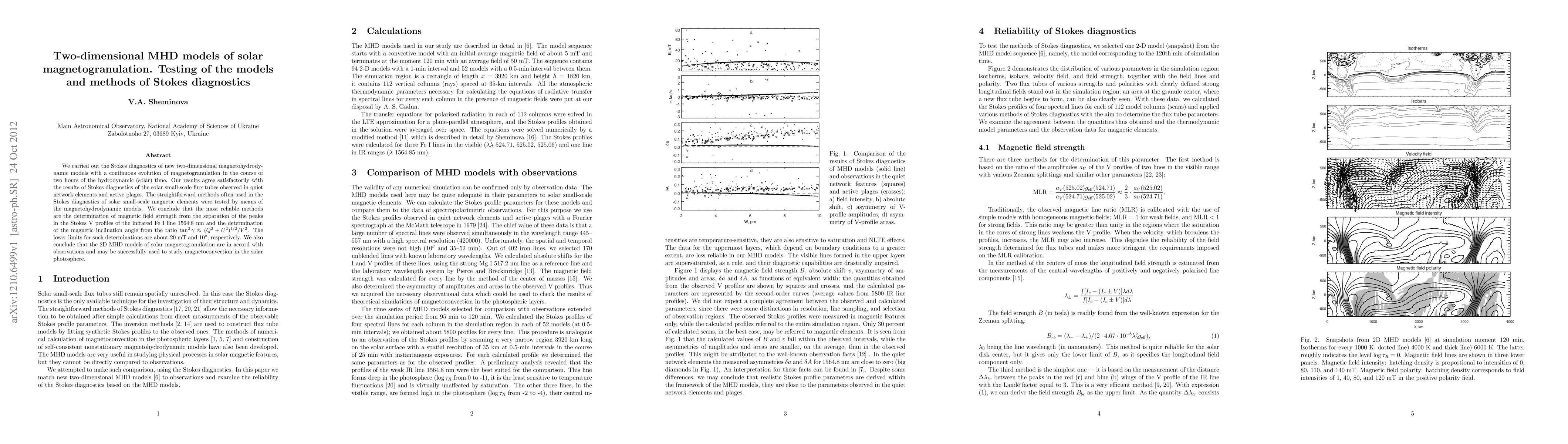 This paper tests two-dimensional magnetohydrodynamic models of solar magnetogranulation using Stokes diagnostics, finding that the models align well with observations of solar small-scale flux tubes. The study identifies reliable methods for determining magnetic field strength and inclination angle, suggesting the models are valid for studying magnetoconvection in the solar photosphere.