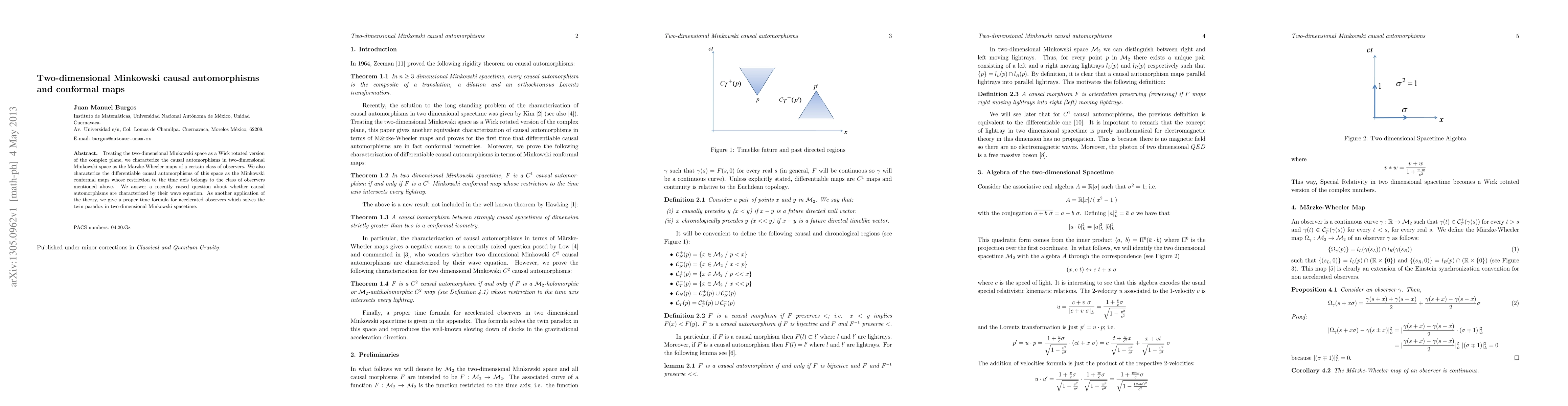 This paper characterizes causal automorphisms in two-dimensional Minkowski space as Márzk-Wheeler maps for specific observers, identifying them as Minkowski conformal maps. It resolves the question of whether these automorphisms are defined by their wave equation and provides a solution to the twin paradox for accelerated observers.