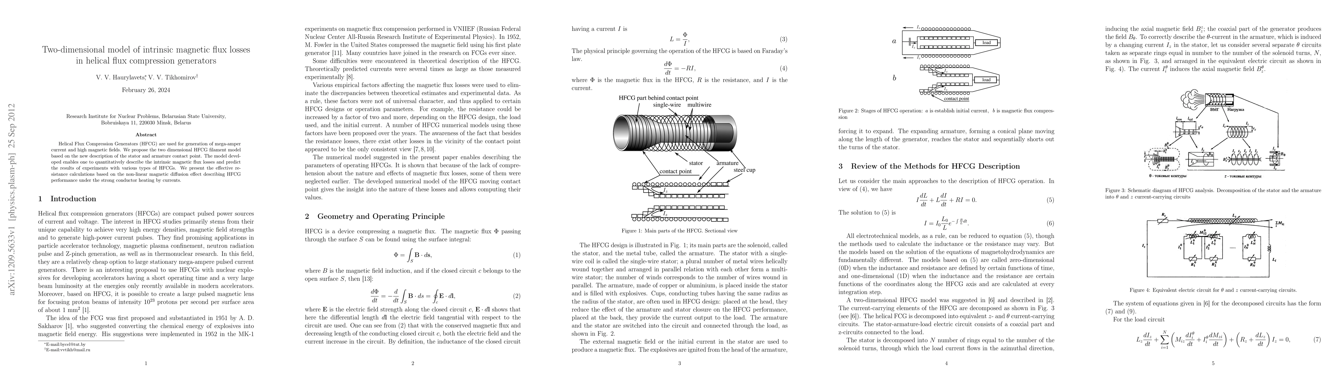 Helical Flux Compression Generators (HFCG) are used for generation of mega-amper current and high magnetic fields. We propose the two dimensional HFCG filament model based on the new description of the stator and armature contact point. The model developed enables one to quantitatively describe the intrinsic magnetic flux losses and predict the results of experiments with various types of HFCGs. We present the effective resistance calculations based on the non-linear magnetic diffusion effect describing HFCG performance under the strong conductor heating by currents.