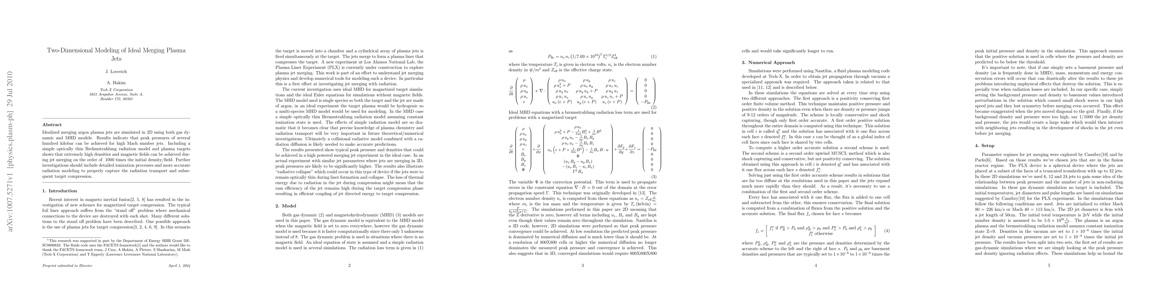 Researchers simulated 2D merging argon plasma jets and found peak pressures of hundreds of kilobars can be achieved. The simulations also revealed high densities and magnetic fields during jet merging, with densities up to ~1000 times the initial value.