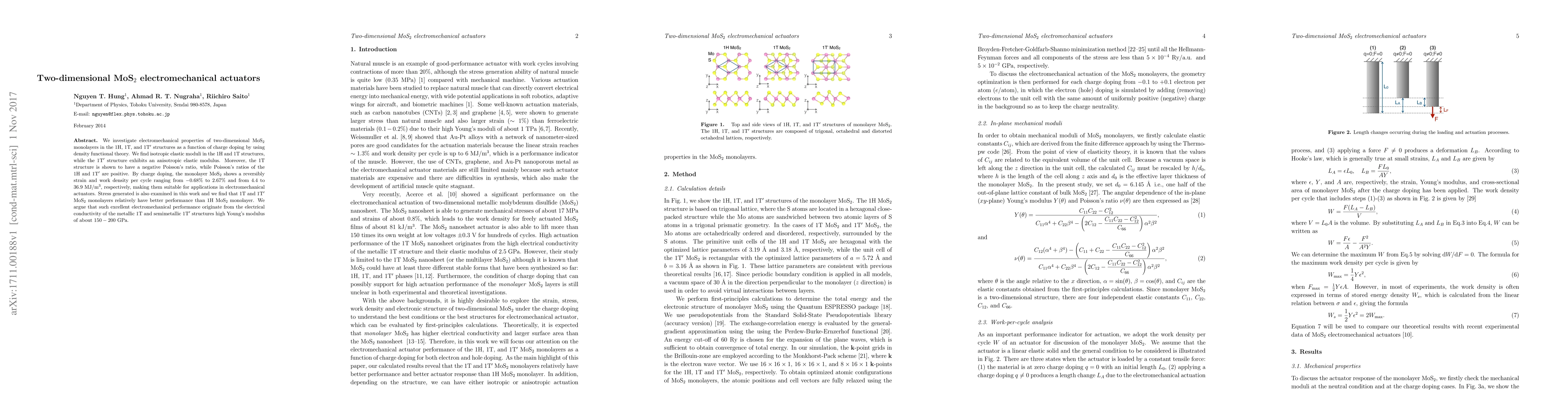 We investigate electromechanical properties of two-dimensional MoS$_2$ monolayers in the 1H, 1T, and 1T$^\prime$ structures as a function of charge doping by using density functional theory. We find isotropic elastic moduli in the 1H and 1T structures, while the 1T$^\prime$ structure exhibits an anisotropic elastic modulus. Moreover, the 1T structure is shown to have a negative Poisson's ratio, while Poisson's ratios of the 1H and 1T$^\prime$ are positive. By charge doping, the monolayer MoS$_2$ shows a reversibly strain and work density per cycle ranging from -0.68% to 2.67% and from 4.4 to 36.9 MJ/m$^3$, respectively, making them suitable for applications in electromechanical actuators. Stress generated is also examined in this work and we find that 1T and 1T$^\prime$ MoS$_2$ monolayers relatively have better performance than 1H MoS$_2$ monolayer. We argue that such excellent electromechanical performance originate from the electrical conductivity of the metallic 1T and semimetallic 1T$^\prime$ structures high Young's modulus of about $150-200$ GPa.