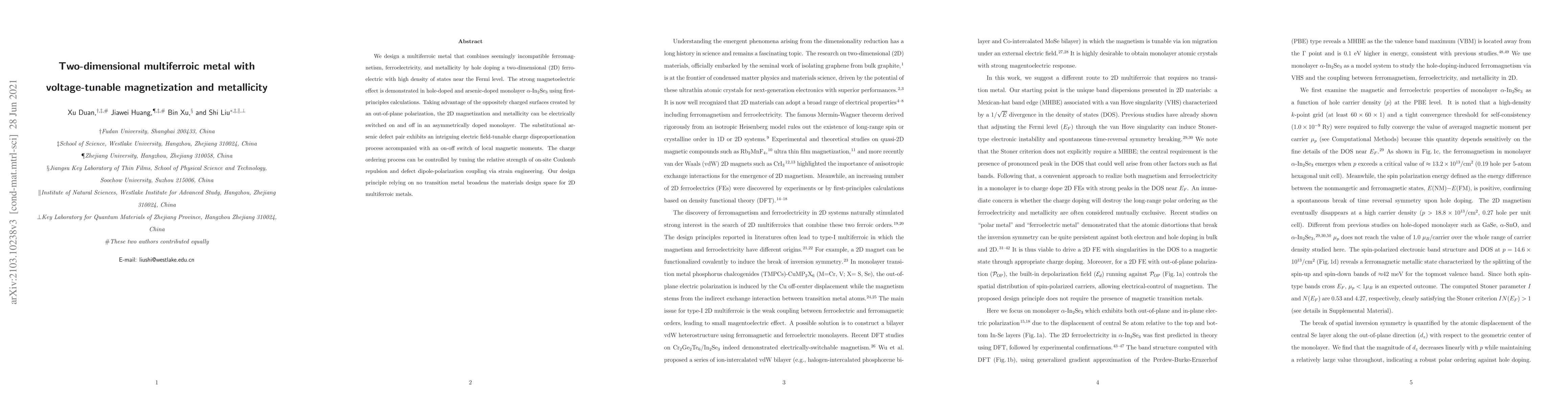 This research designs a two-dimensional multiferroic metal that integrates ferromagnetism, ferroelectricity, and metallicity through hole doping in a 2D ferroelectric. The study demonstrates a strong magnetoelectric effect in arsenic-doped monolayer α-In2Se3, enabling electric control of magnetization and metallicity.