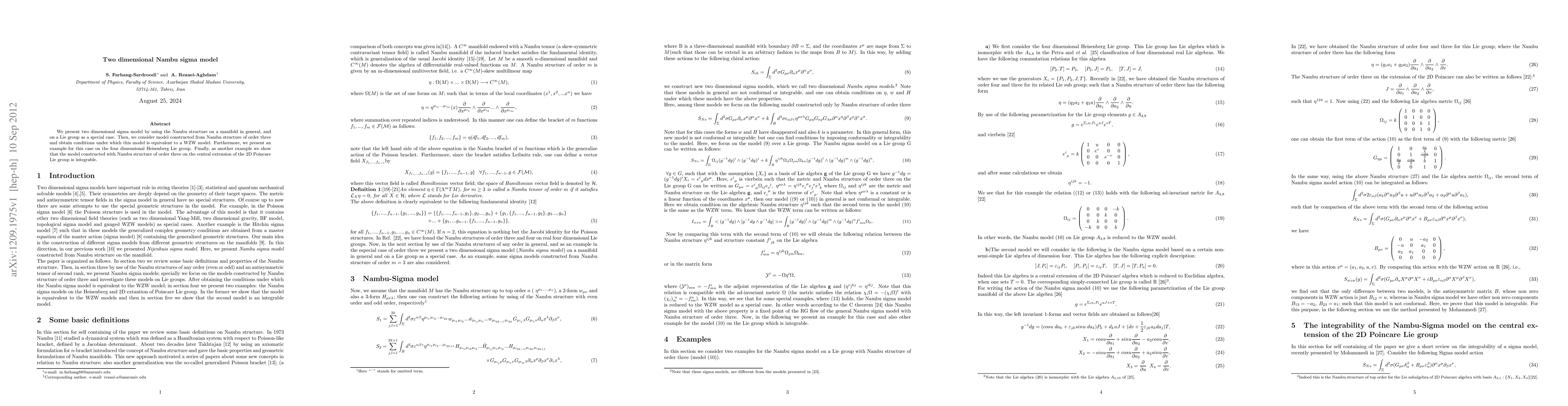We present two dimensional sigma model by using the Nambu structure on a manifold in general, and on a Lie group as a special case. Then, we consider model constructed from Nambu structure of order three and obtain conditions under which this model is equivalent to a WZW model. Furthermore, we present an example for this case on the four dimensional Heisenberg Lie group. Finally, as another example we show that the model constructed with Nambu structure of order three on the central extension of the 2D Poincare Lie group is integrable.