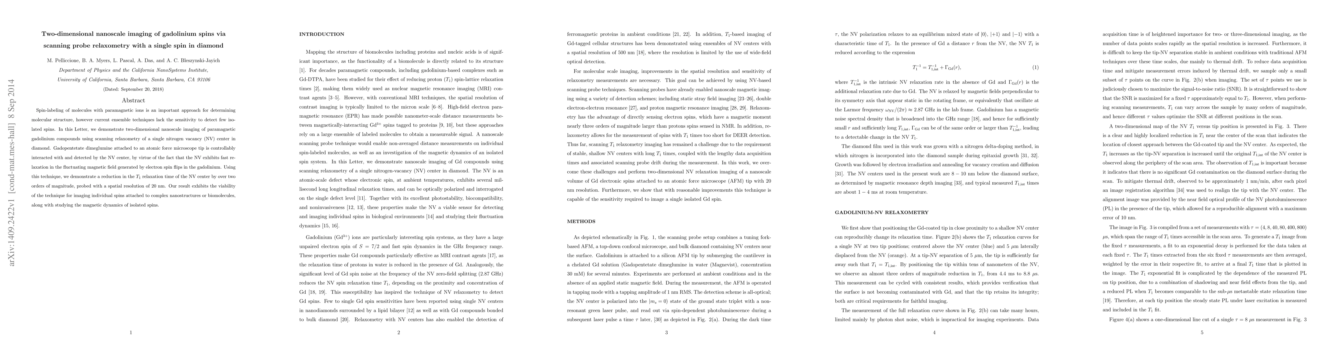 This paper demonstrates the use of scanning probe relaxometry with a single nitrogen vacancy center in diamond to achieve two-dimensional nanoscale imaging of paramagnetic gadolinium spins. The technique shows a significant reduction in the $T_1$ relaxation time, indicating potential for imaging isolated spins and studying magnetic dynamics.