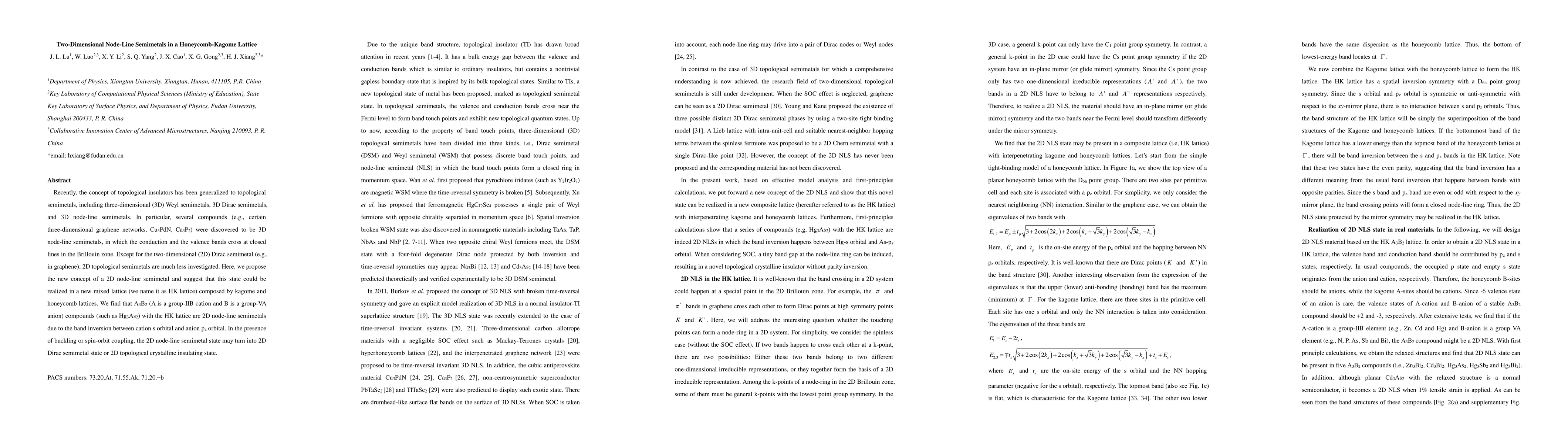This paper introduces the concept of two-dimensional (2D) node-line semimetals in a novel honeycomb-kagome lattice (HK lattice). It proposes that A3B2 compounds like Hg3As2 exhibit this state due to band inversion, and discusses potential transformations to Dirac semimetal or topological insulator states under buckling or spin-orbit coupling.