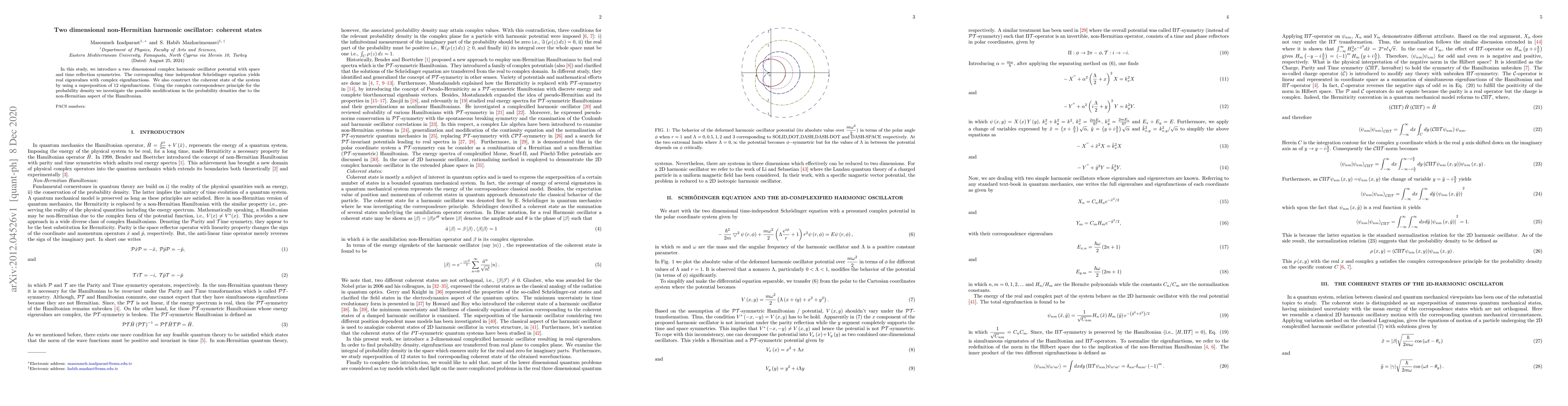 In this study, we introduce a two dimensional complex harmonic oscillator potential with space and time reflection symmetries. The corresponding time independent Schr\"odinger equation yields real eigenvalues with complex eigenfunctions. We also construct the coherent state of the system by using a superposition of 12 eigenfunctions. Using the complex correspondence principle for the probability density we investigate the possible modifications in the probability densities due to the non-Hermitian aspect of the Hamiltonian.