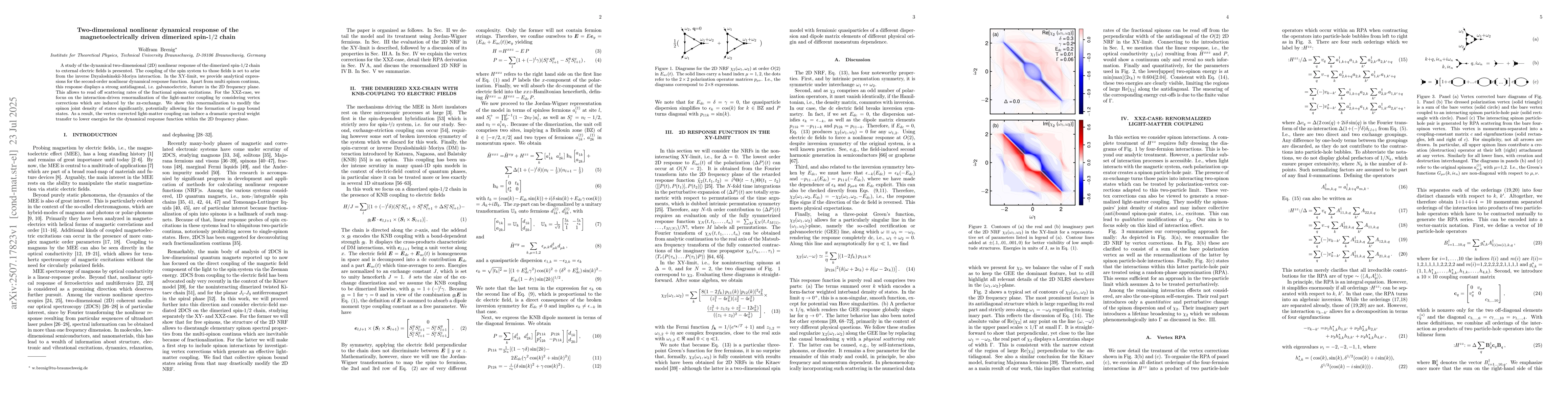 A study of the dynamical two-dimensional (2D) nonlinear response of the dimerized spin-$1{/}2$ chain to external electric fields is presented. The coupling of the spin system to those fields is set to arise from the inverse Dzyaloshinskii-Moriya interaction. In the XY-limit, we provide analytical expressions for the second-order nonlinear dynamical response function. Apart from multi spinon continua, this response displays a strong antidiagonal, i.e. galvanoelectric, feature in the 2D frequency plane. This allows to read off scattering rates of the fractional spinon excitations. For the XXZ-case, we focus on the interaction-driven renormalization of the light-matter coupling by considering vertex corrections which are induced by the zz-exchange. We show this renormalization to modify the spinon joint density of states significantly, potentially allowing for the formation of in-gap bound states. As a result, the vertex corrected light-matter coupling can induce a dramatic spectral weight transfer to lower energies for the dynamical response function within the 2D frequency plane.
