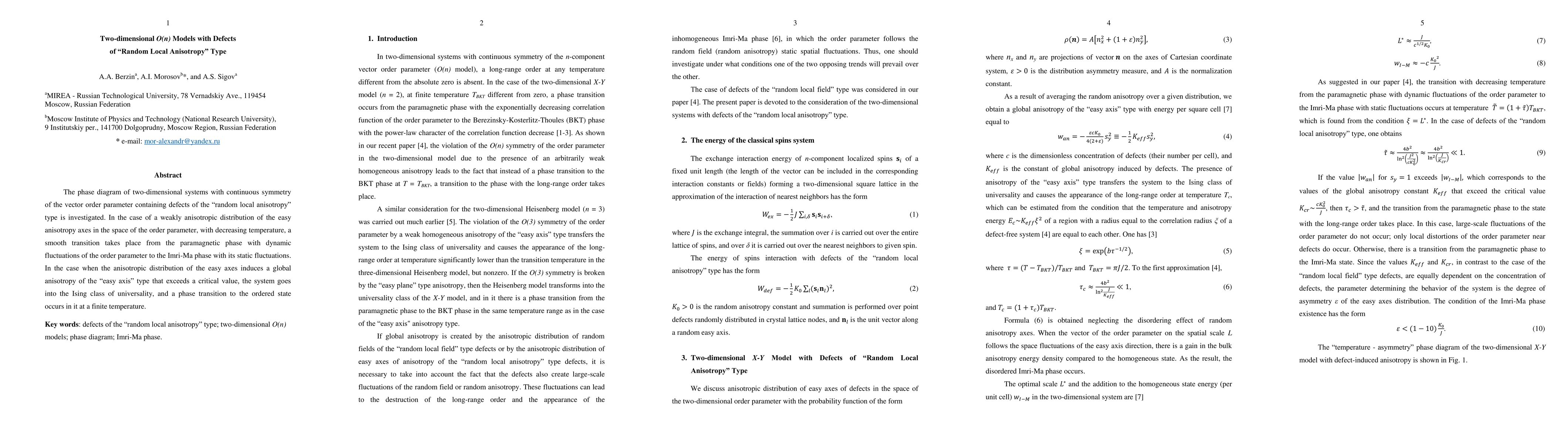 The phase diagram of two-dimensional systems with continuous symmetry of the vector order parameter containing defects of the "random local anisotropy" type is investigated. In the case of a weakly anisotropic distribution of the easy anisotropy axes in the space of the order parameter, with decreasing temperature, a smooth transition takes place from the paramagnetic phase with dynamic fluctuations of the order parameter to the Imri-Ma phase with its static fluctuations. In the case when the anisotropic distribution of the easy axes induces a global anisotropy of the "easy axis" type that exceeds a critical value, the system goes into the Ising class of universality, and a phase transition to the ordered state occurs in it at a finite temperature.