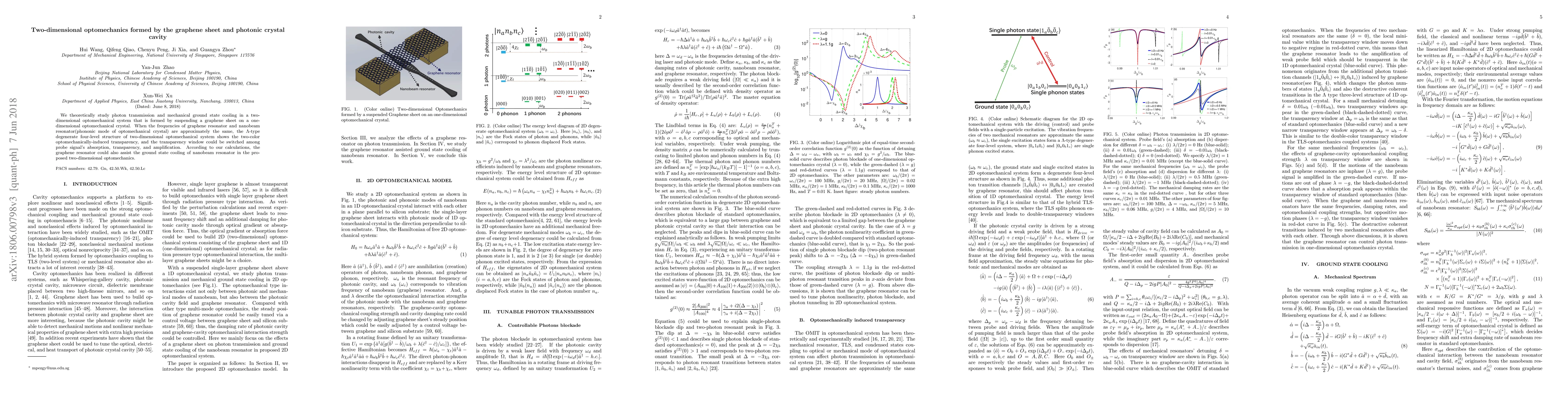 This paper investigates a two-dimensional optomechanical system combining a graphene sheet and a photonic crystal cavity, demonstrating photon transmission and mechanical ground state cooling. The system exhibits tunable two-color optomechanically-induced transparency, with the transparency window switchable between absorption, transparency, and amplification, while also aiding in the cooling of a large damping nanobeam resonator.