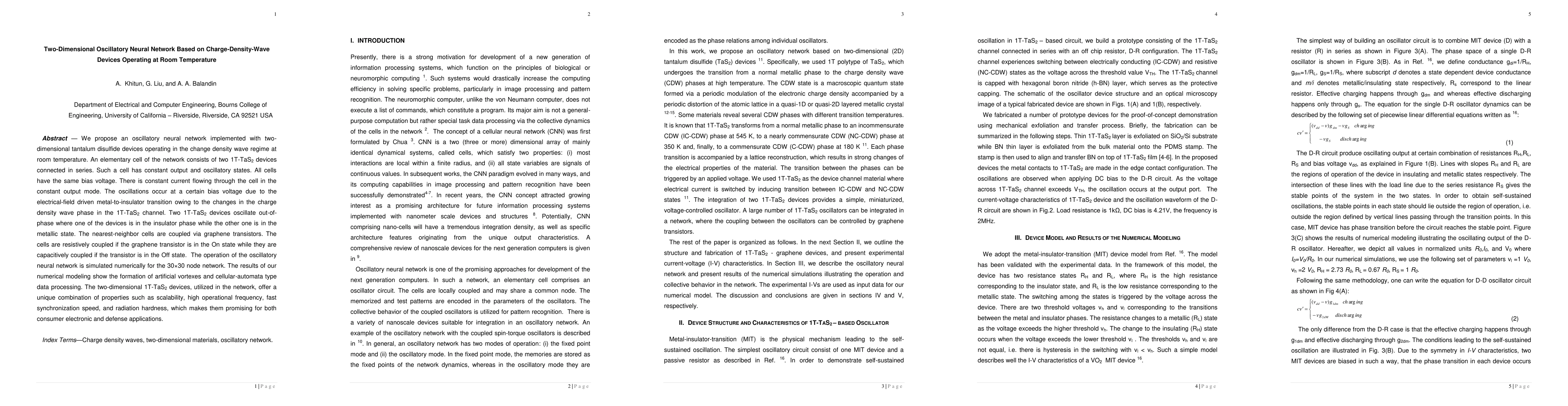 We propose an oscillatory neural network implemented with two-dimensional tantalum disulfide devices operating in the change density wave regime at room temperature. An elementary cell of the network consists of two 1T-TaS2 devices connected in series. Such a cell has constant output and oscillatory states. All cells have the same bias voltage. There is constant current flowing through the cell in the constant output mode. The oscillations occur at a certain bias voltage due to the electrical-field driven metal-to-insulator transition owing to the changes in the charge density wave phase in the 1T-TaS2 channel. Two 1T-TaS2 devices oscillate out-of-phase where one of the devices is in the insulator phase while the other one is in the metallic state. The nearest-neighbor cells are coupled via graphene transistors. The cells are resistively coupled if the graphene transistor is in the On state while they are capacitively coupled if the transistor is in the Off state. The operation of the oscillatory neural network is simulated numerically for the 30x30 node network. The results of our numerical modeling show the formation of artificial vortexes and cellular-automata type data processing. The two-dimensional 1T-TaS2 devices, utilized in the network, offer a unique combination of properties such as scalability, high operational frequency, fast synchronization speed, and radiation hardness, which makes them promising for both consumer electronic and defense applications.