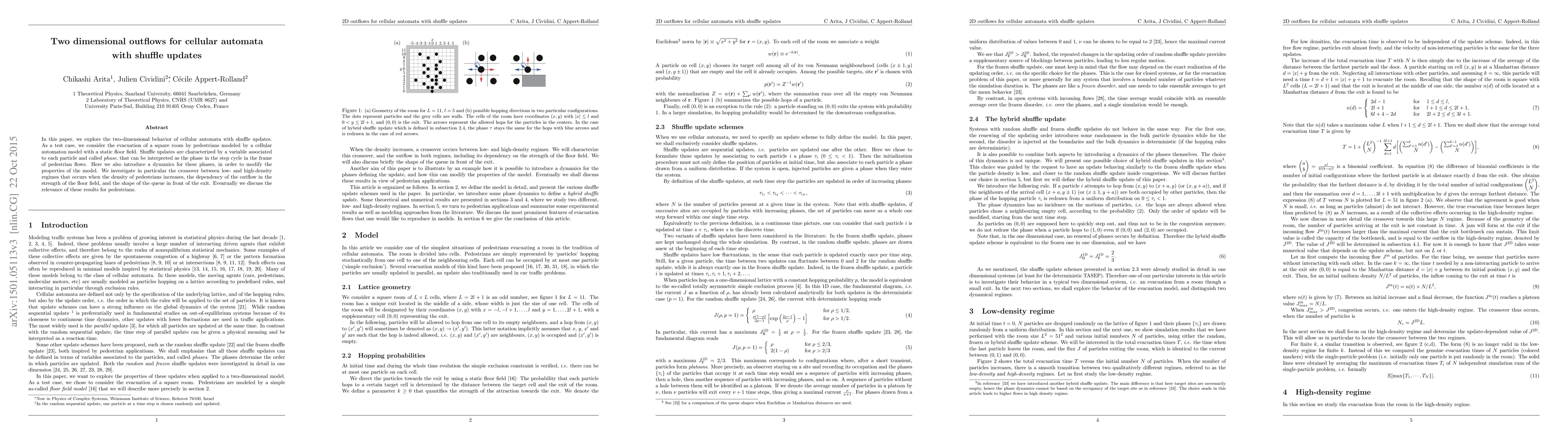In this paper, we explore the two-dimensional behavior of cellular automata with shuffle updates. As a test case, we consider the evacuation of a square room by pedestrians modeled by a cellular automaton model with a static floor field. Shuffle updates are characterized by a variable associated to each particle and called phase, that can be interpreted as the phase in the step cycle in the frame of pedestrian flows. Here we also introduce a dynamics for these phases, in order to modify the properties of the model. We investigate in particular the crossover between low- and high-density regimes that occurs when the density of pedestrians increases, the dependency of the outflow in the strength of the floor field, and the shape of the queue in front of the exit. Eventually we discuss the relevance of these results for pedestrians.