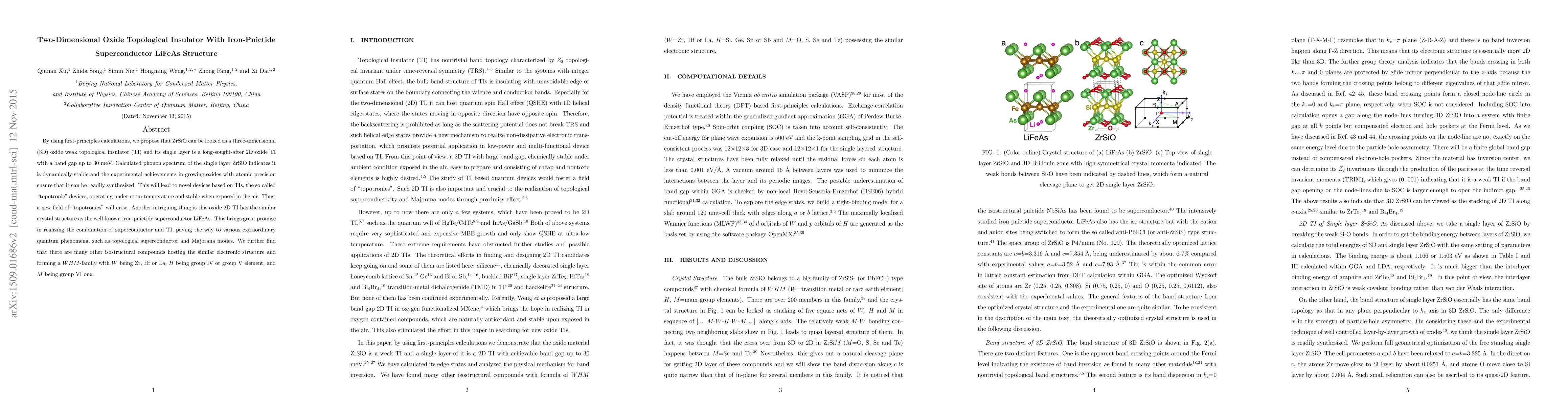 This research proposes that ZrSiO is a two-dimensional oxide topological insulator with a band gap of up to 30 meV, potentially leading to novel "topotronic" devices operating at room temperature. The similar crystal structure to LiFeAs suggests promising possibilities for combining superconductivity and topological insulators, opening avenues for extraordinary quantum phenomena.
