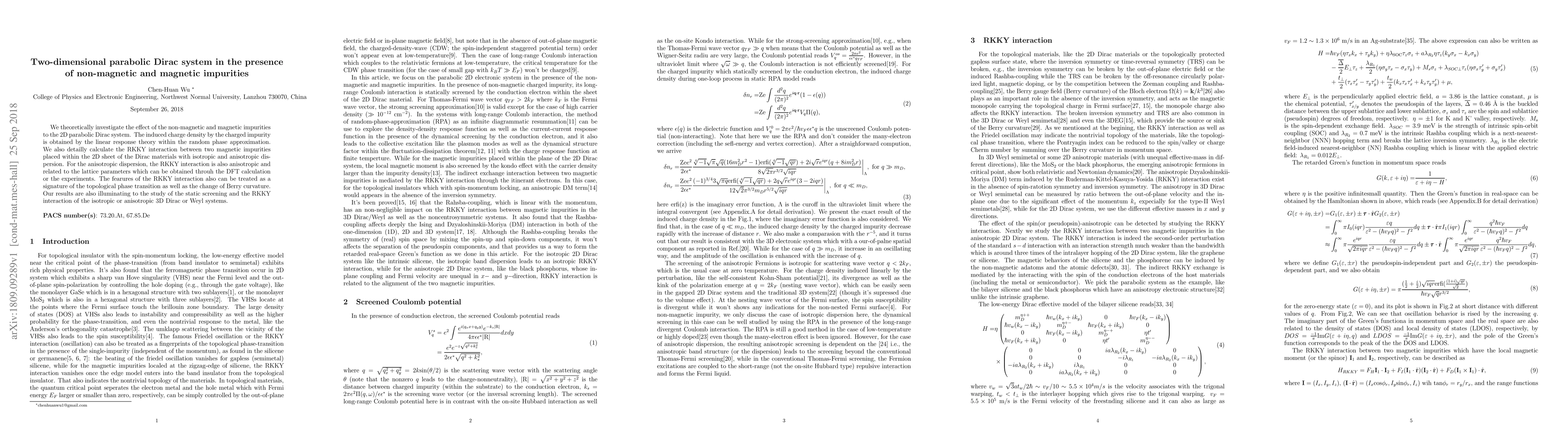 We theoretically investigate the effect of the non-magnetic and magnetic impurities to the 2D parabolic Dirac system. The induced charge density by the charged impuri- ty is obtained by the linear response theory within the random phase approximation. We also detailly calculate the RKKY interaction between two magnetic impurities placed within the 2D sheet of the Dirac materials with isotropic and anisotropic dis- persion. For the anisotropic dispersion, the RKKY interaction is also anisotropic and related to the lattice parameters which can be obtained throuh the DFT calculation or the experiments. The fearures of the RKKY interaction also can be treated as a signature of the topological phase transition as well as the change of Berry curvature. Our results are also illuminating to the study of the static screening and the RKKY interaction of the isotropic or anisotropic 3D Dirac or Weyl systems.