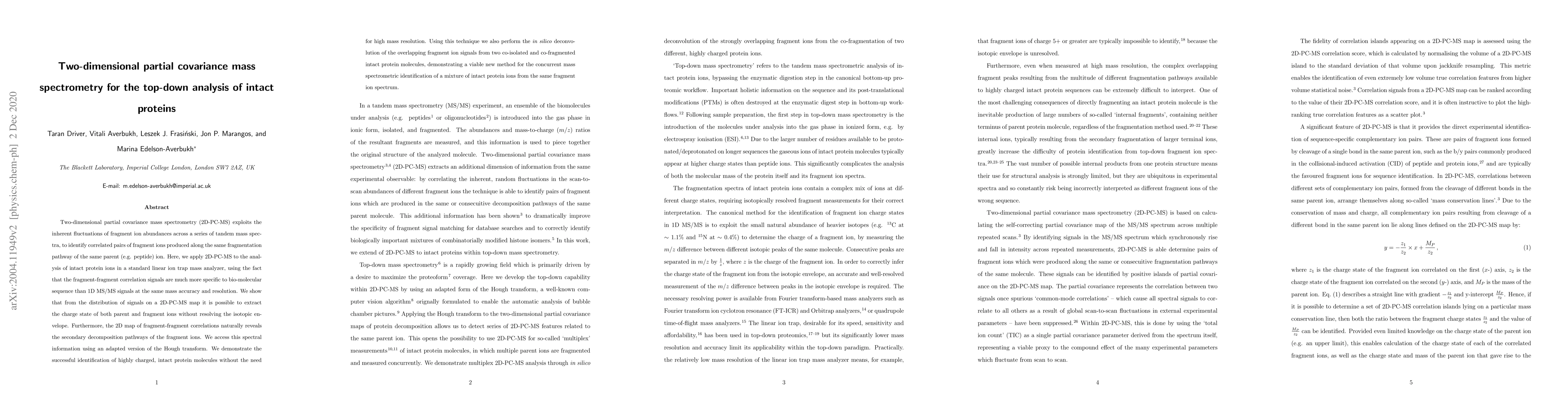Two-dimensional partial covariance mass spectrometry (2D-PC-MS) identifies correlated fragment ions from the same protein to analyze intact proteins without high mass resolution. The technique allows for the extraction of charge states and reveals secondary decomposition pathways, enabling the identification of highly charged proteins and the deconvolution of overlapping signals from co-isolated protein molecules.