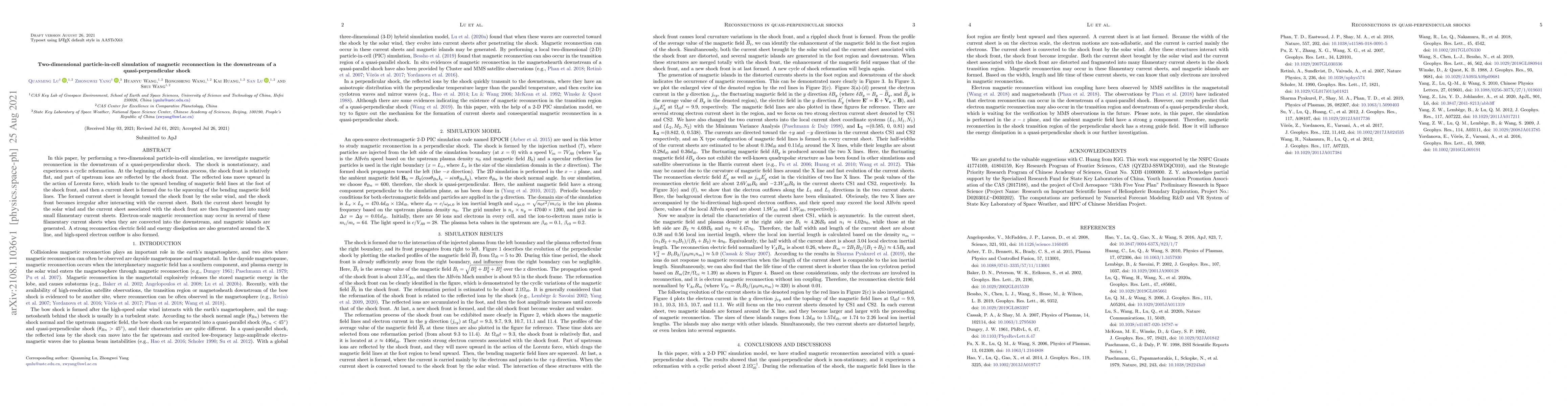 This paper uses a two-dimensional particle-in-cell simulation to study magnetic reconnection in the downstream of a quasi-perpendicular shock, revealing the formation and fragmentation of current sheets and electron-scale reconnection generating magnetic islands and high-speed electron outflows.