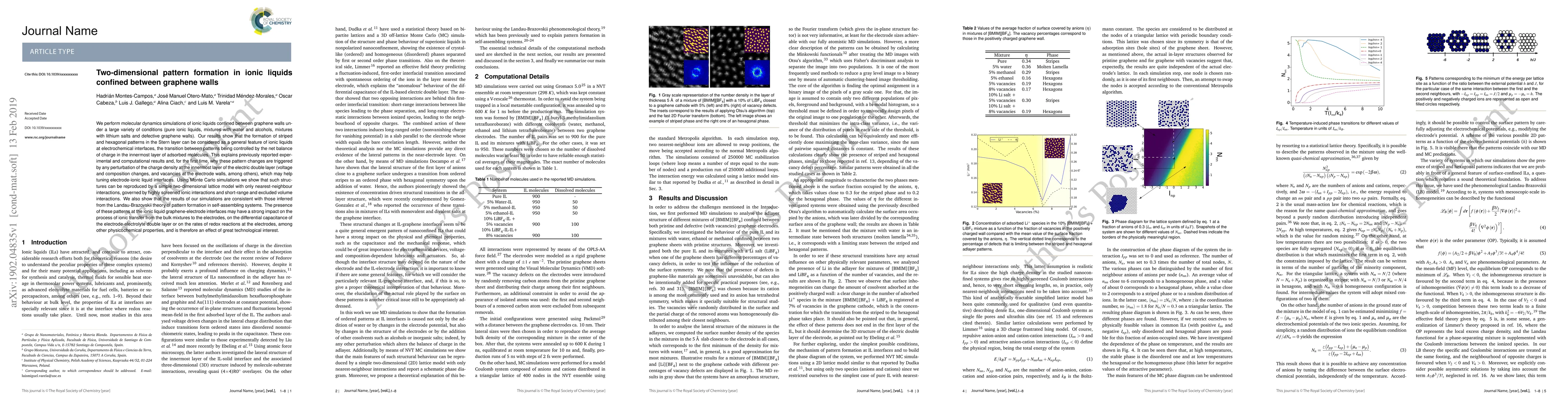 This paper reports molecular dynamics simulations revealing the formation of striped and hexagonal patterns in ionic liquids confined between graphene walls, which is influenced by charge balance in the Stern layer. The study explains pattern transitions via charge density perturbations and suggests these structures impact electrode-ionic liquid interfaces, with implications for ionic transfer, differential capacitance, and redox reaction rates.