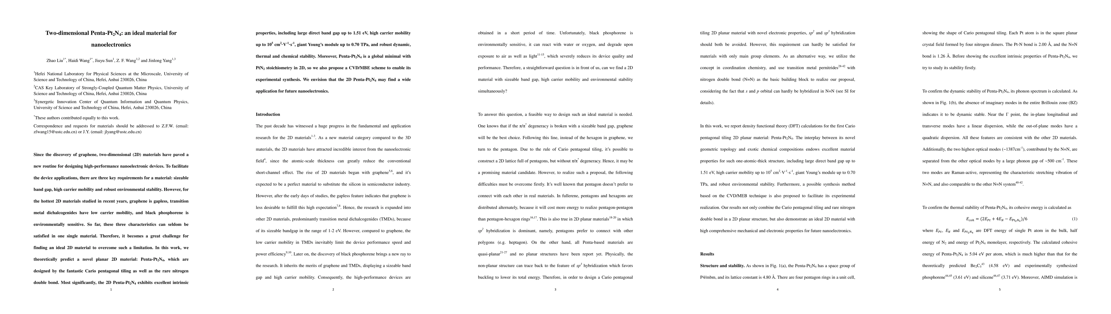 Since the discovery of graphene, two-dimensional (2D) materials have paved a new routine for designing high-performance nanoelectronic devices. To facilitate the device applications, there are three key requirements for a material: sizeable band gap, high carrier mobility and robust environmental stability. However, for the hottest 2D materials studied in recent years, graphene is gapless, transition metal dichalcogenides have low carrier mobility, and black phosphorene is environmentally sensitive. So far, these three characteristics can seldom be satisfied in one single material. Therefore, it becomes a great challenge for finding an ideal 2D material to overcome such a limitation. In this work, we theoretically predict a novel planar 2D material: Penta-Pt2N4, which are designed by the fantastic Cario pentagonal tiling as well as the rare nitrogen double bond. Most significantly, the 2D Penta-Pt2N4 exhibits excellent intrinsic properties, including large direct band gap up to 1.51 eV, high carrier mobility up to 105 cm2V-1s-1, giant Young's module up to 0.70 TPa, and robust dynamic, thermal and chemical stability. Moreover, Penta-Pt2N4 is a global minimal with PtN2 stoichiometry in 2D, so we also propose a CVD/MBE scheme to enable its experimental synthesis. We envision that the 2D Penta-Pt2N4 may find a wide application for future nanoelectronics.