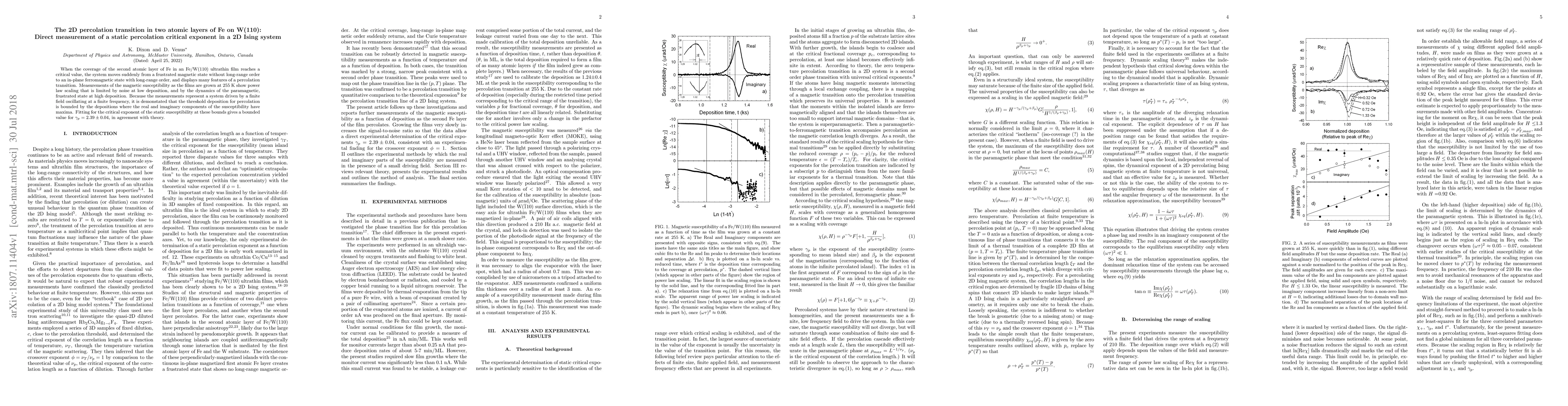 When the coverage of the second atomic layer of Fe in an Fe/W(110) ultrathin film reaches a critical value, the system moves suddenly from a frustrated magnetic state without long-range order to an in-plane ferromagnetic state with long-range order, and displays many features of a percolation transition. Measurements of the magnetic susceptibility as the films are grown at 255 K show power law scaling that is limited by noise at low deposition, and by the dynamics of the paramagnetic, frustrated state at high deposition. Because the measurements represent a system driven by a finite field oscillating at a finite frequency, it is demonstated that the threshold deposition for percolation is bounded by the depositions where the real and imaginary components of the susceptibility have maxima. Fitting for the critical exponent of the static susceptibility at these bounds gives a bounded value for $\gamma_p=2.39\pm0.04$, in agreement with theory.